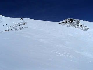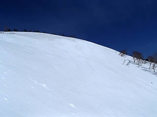 とりあえず摩利支天岳と富士見岳の間の稜線に登る斜面(通称すべり台)の途中まで登って見ることにします。まさかの吹き溜まりのパウダーを期待したのですが、残念ながら私が訪れた範囲では柔らかパウダーはありませんでした(^^;。