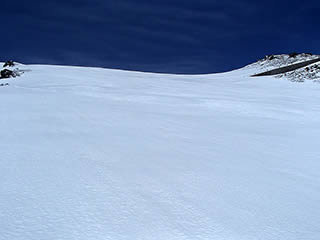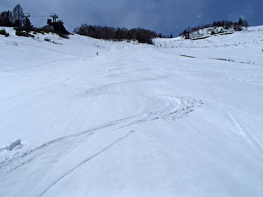 すべり台側の斜面に引き返し、アルペンターンで滑り降ります。ハードパックバーンなので、シュプールはうっすら程度です。
