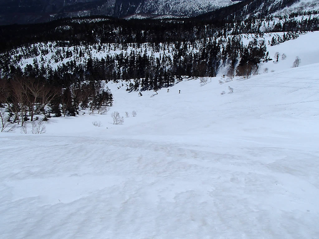 斜面を見上げても、新雪がすっかり飛ばされたカリカリバーンか、新雪が強風でハードパックされたバーンしかさなそうですので、今回はギアのトラブルもありますし無理をせずここまでとします。