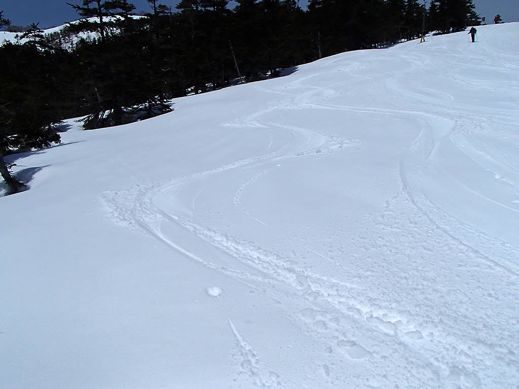 でも風下側の吹き溜まりでは10cmほどの比較的柔らかい新雪の部分もありました。ざらめで無い真っ白な新雪を滑るのは今シーズンこれが最後かなあ。