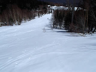 数日前に降った湿った新雪が朝の冷え込みで堅くなっている、そんなバーンでした。帰りに滑ったときは快適ざらめになっていました。