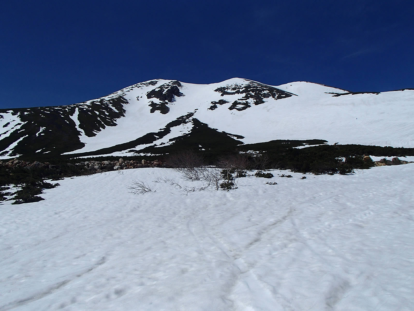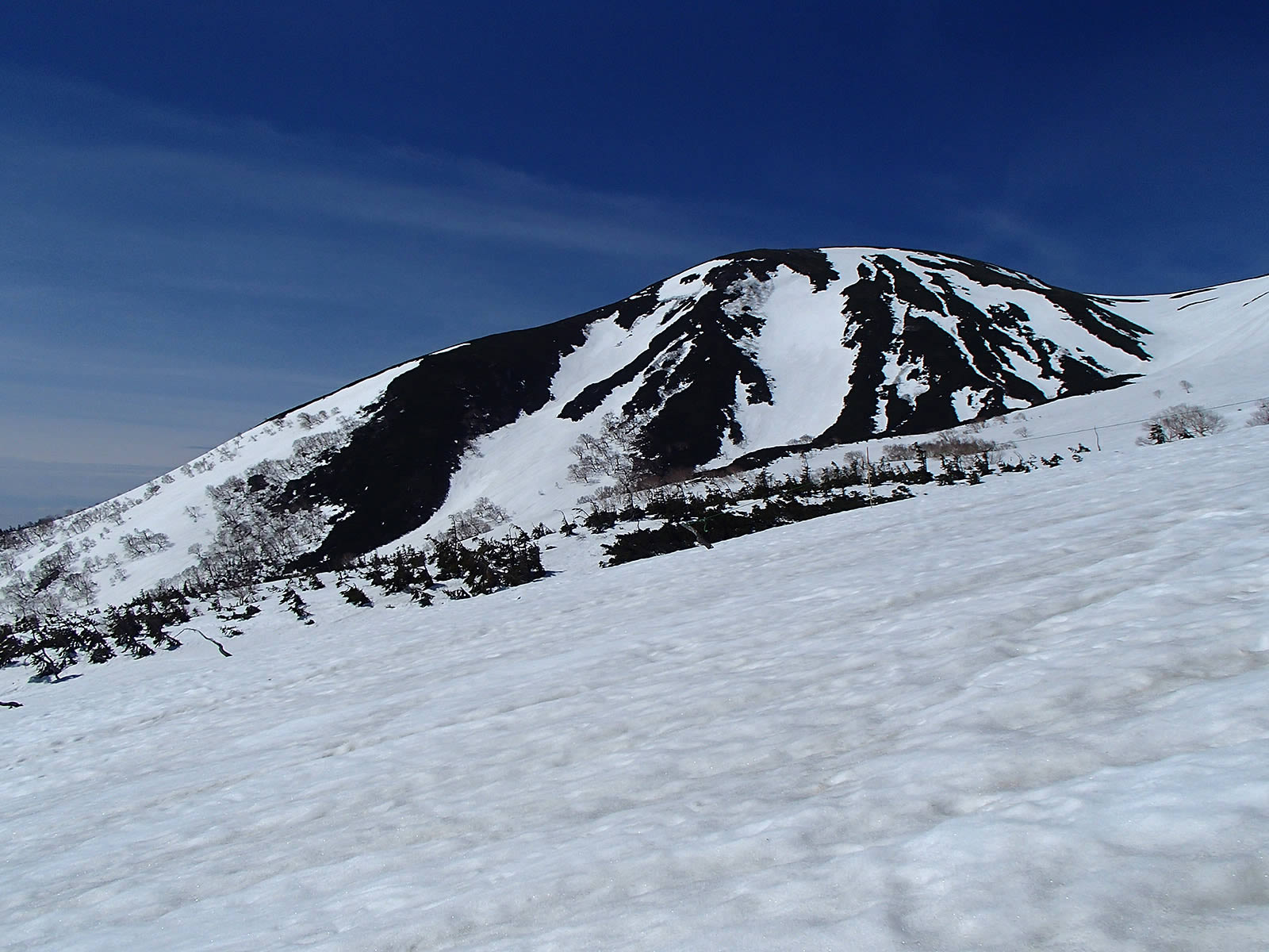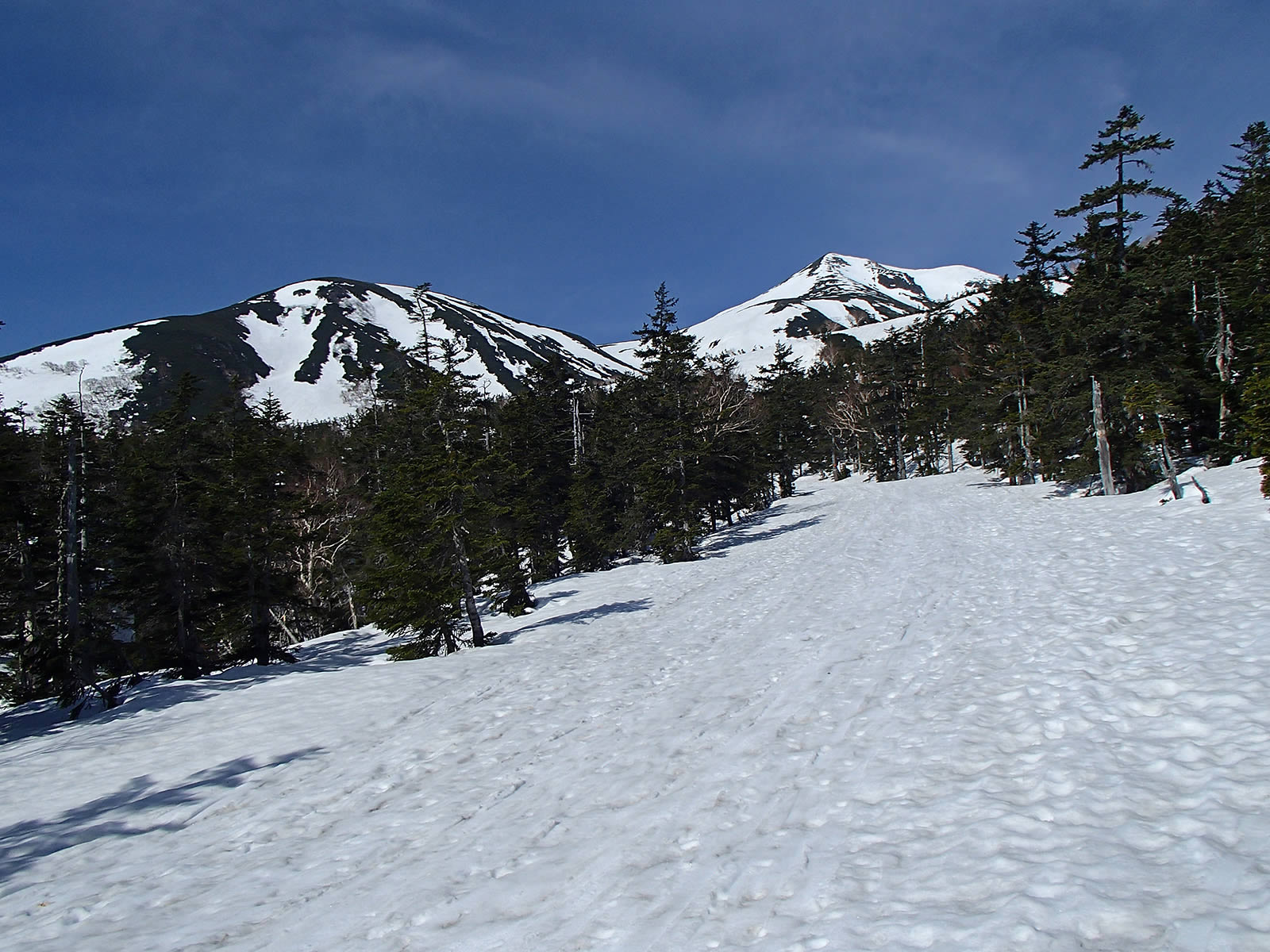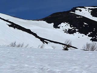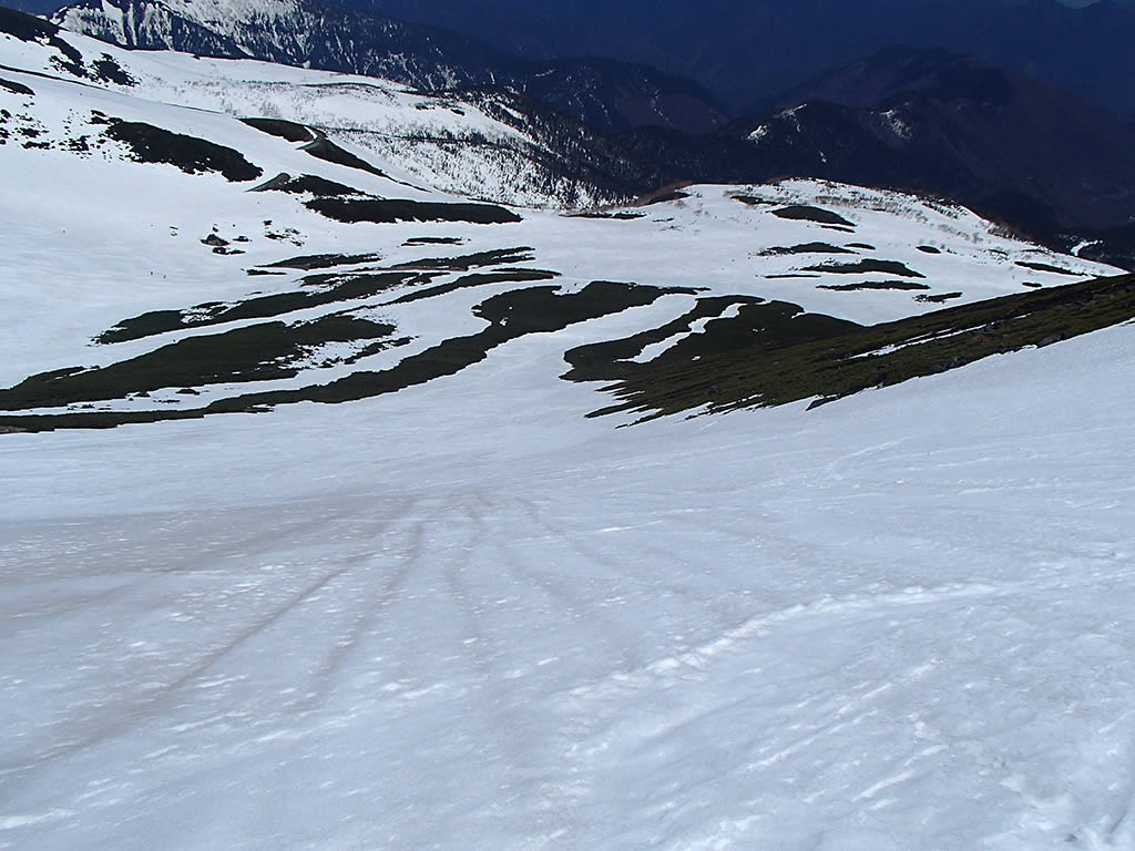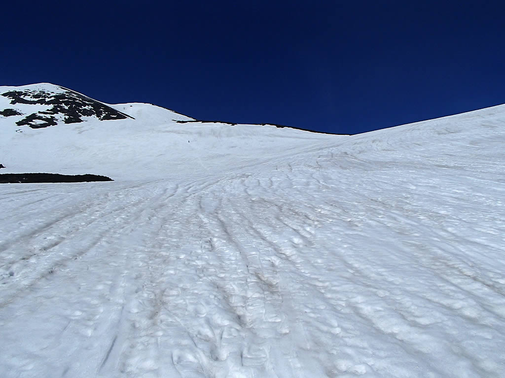 思った以上に雪が緩んでいて全面ざらめ斜面になっていました。ただちょうどこの頃から剣ヶ峰上空にも雲がかかり始めてしまいましたので、もう少し前にスタートすれば良かったかなあ(^^;。