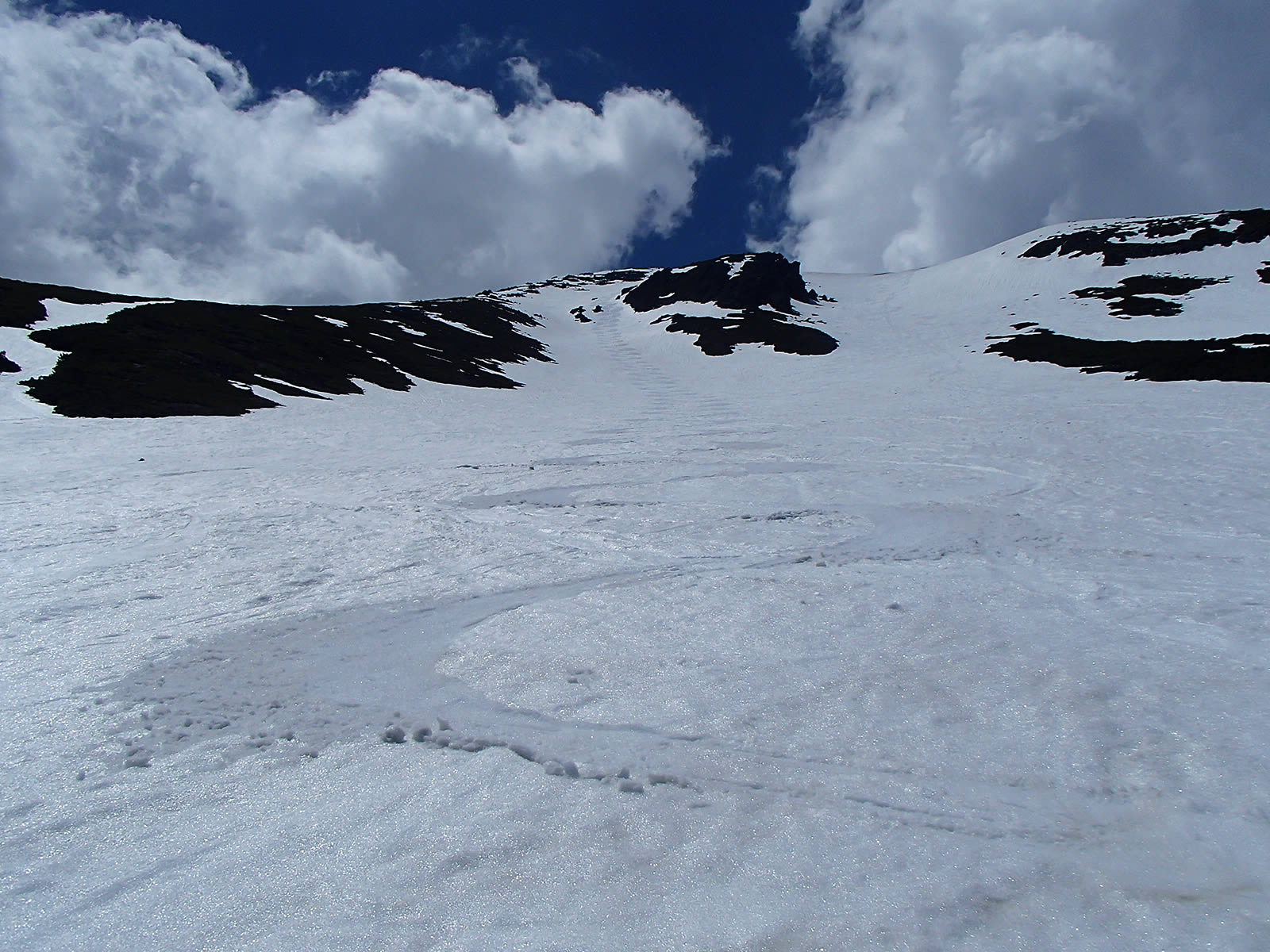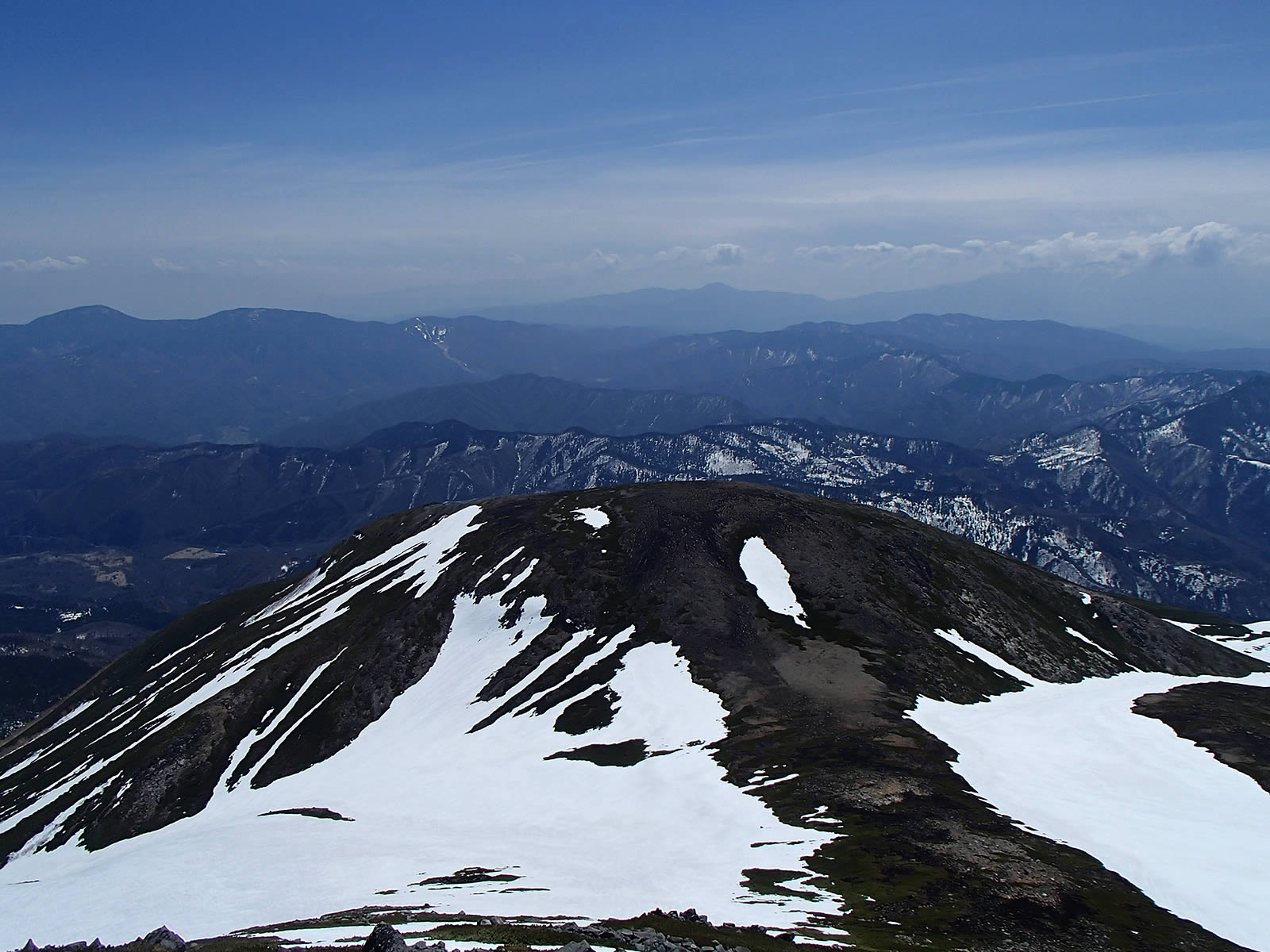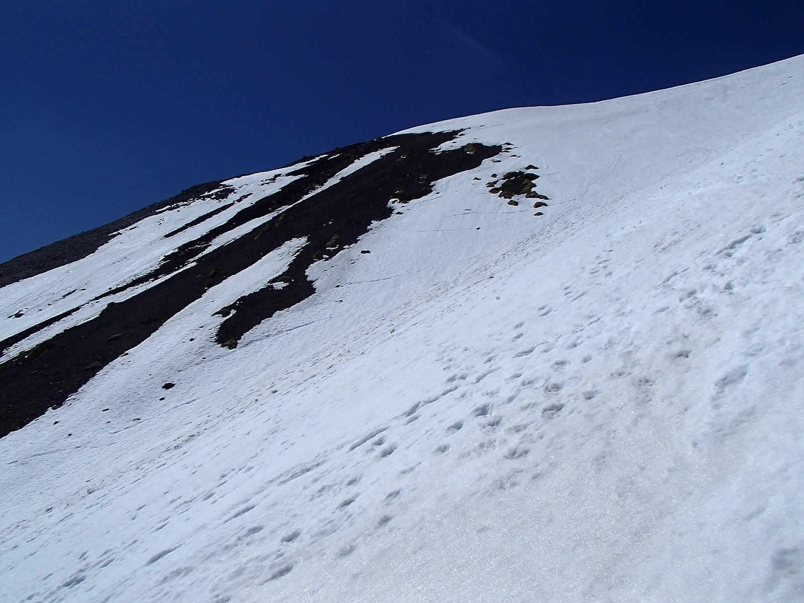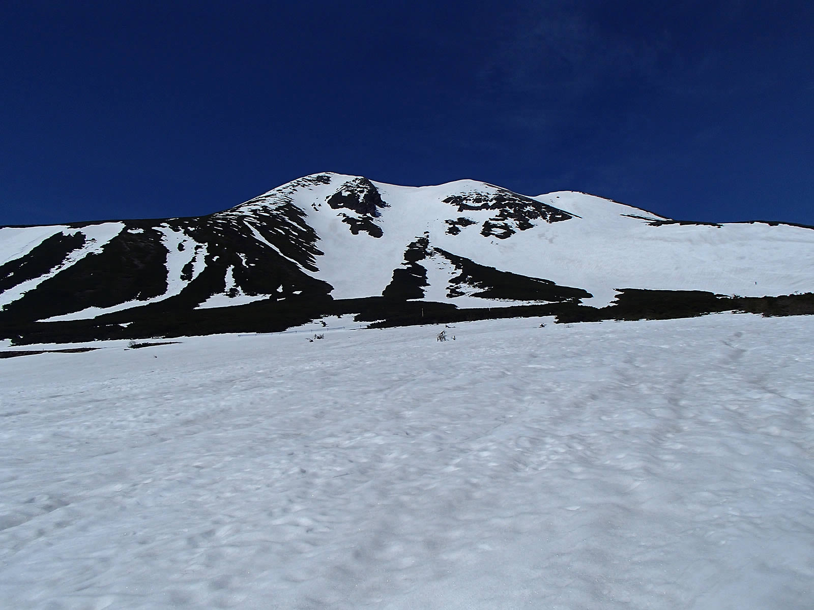 思った以上に雪が緩んでいて全面ざらめ斜面になっていました。ただちょうどこの頃から剣ヶ峰上空にも雲がかかり始めてしまいましたので、もう少し前にスタートすれば良かったかなあ(^^;。