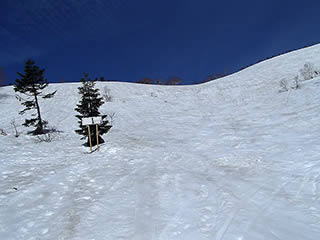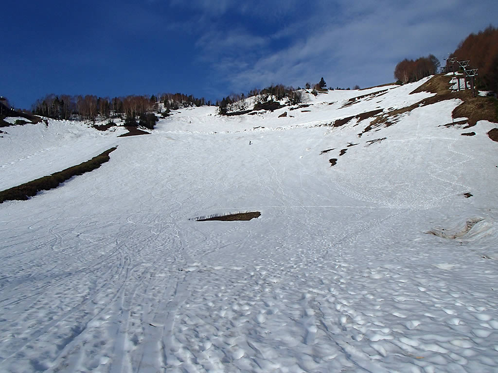 かもしかゲレンデ最上部を通過。この辺りもところどころ藪が顔を出し始めていました。