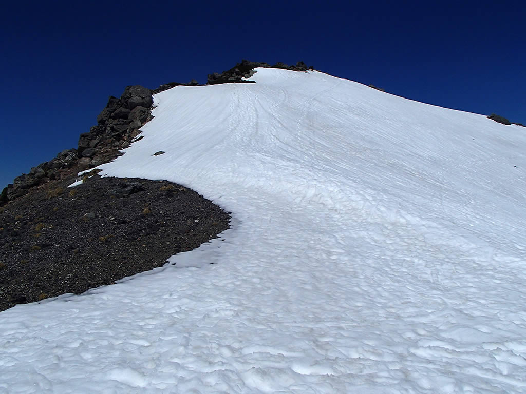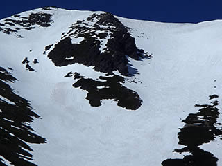 剣ヶ峰をズーム。剣ヶ峰直下のシュートはそれほど荒れていなくて状態は良さそうです。あとはクラストがいつ緩んでくれるかです。