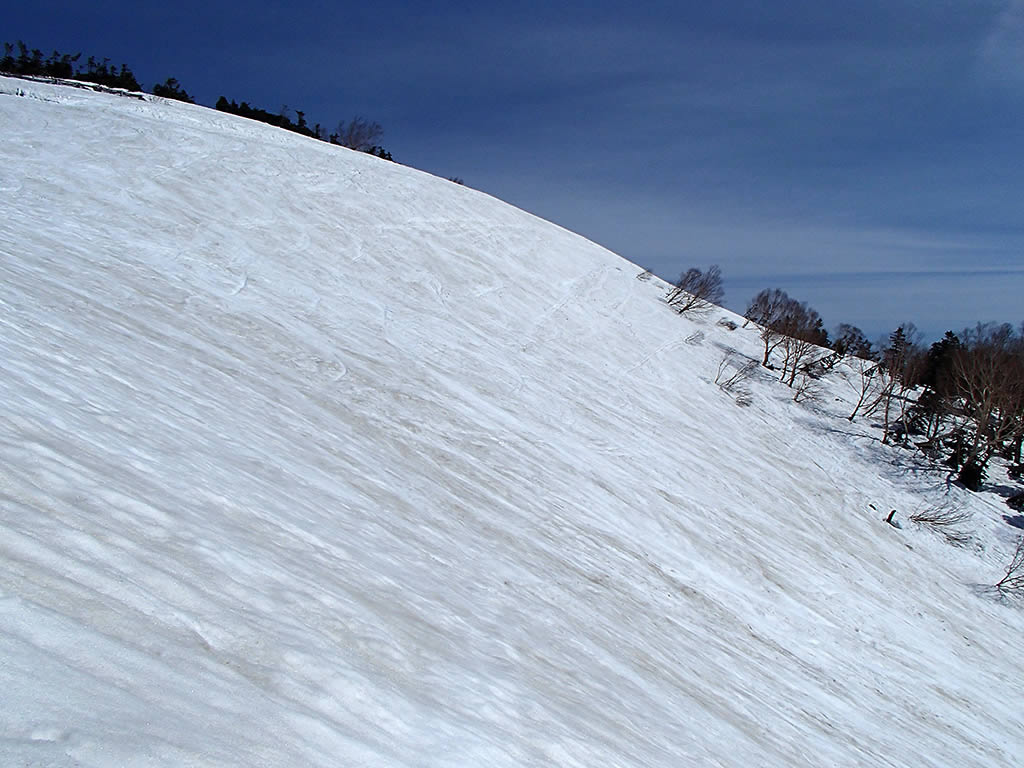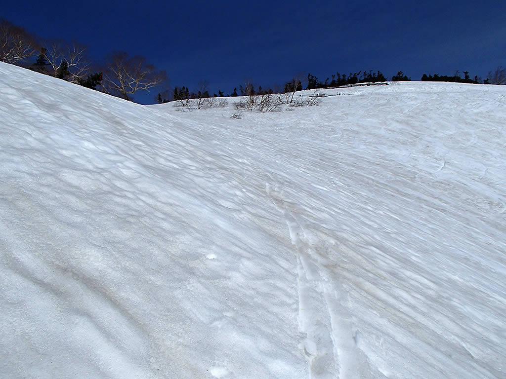 朝日岳から下ってくるこの斜面もそれほど荒れていなくて滑りやすそうです。