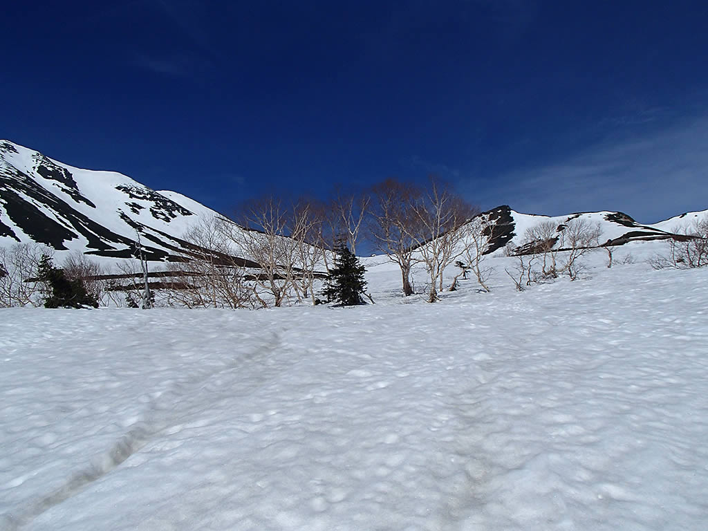 朝日岳、蚕玉岳の間の斜面を上から見下ろします。