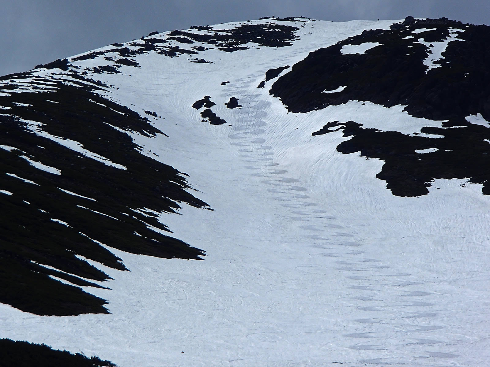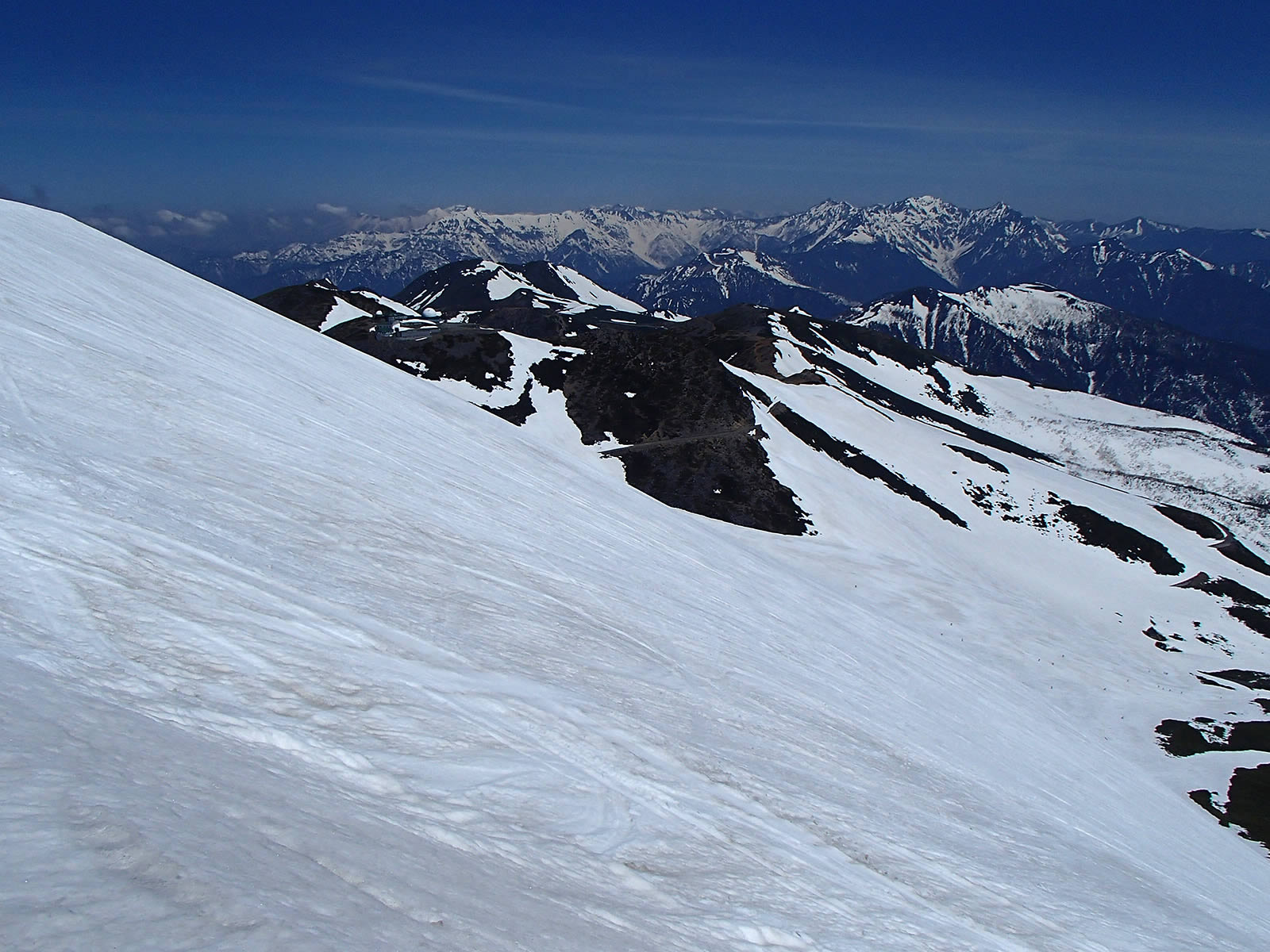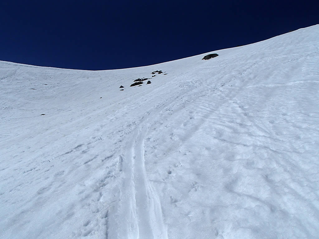 日差しが無いとはっきりとは見えませんが、とりあえずもう一度剣ヶ峰直下のシュートのシュプールをズーム。滑ったあとで見上げながら撮影していると斜面の急さが良く分かりませんが、横から見ると斜面の斜度が良く分かります。
