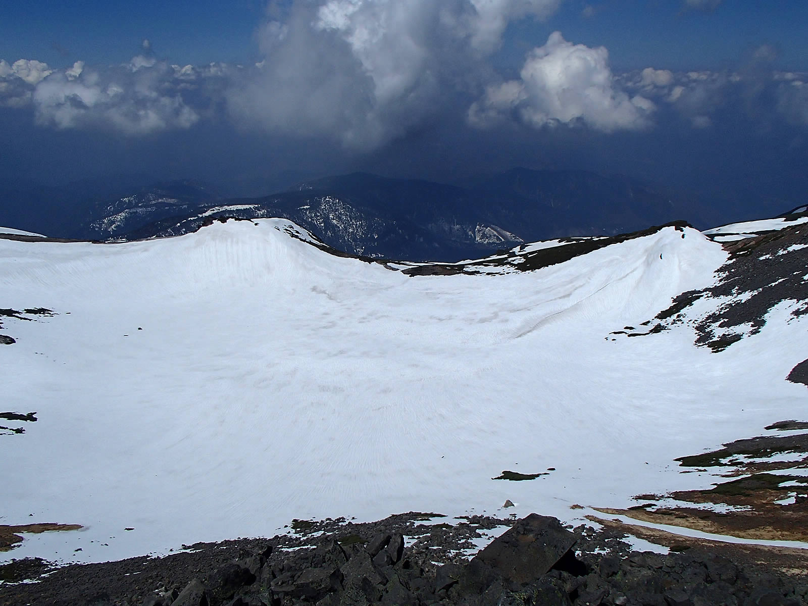 剣ヶ峰を高天ヶ原のコルの斜面をズーム。今回は剣ヶ峰を滑ったあと、余裕があればこちらの斜面も登り返して滑ろうかなと思っていましたが、雲がかかってしまいましたので行きませんでした。