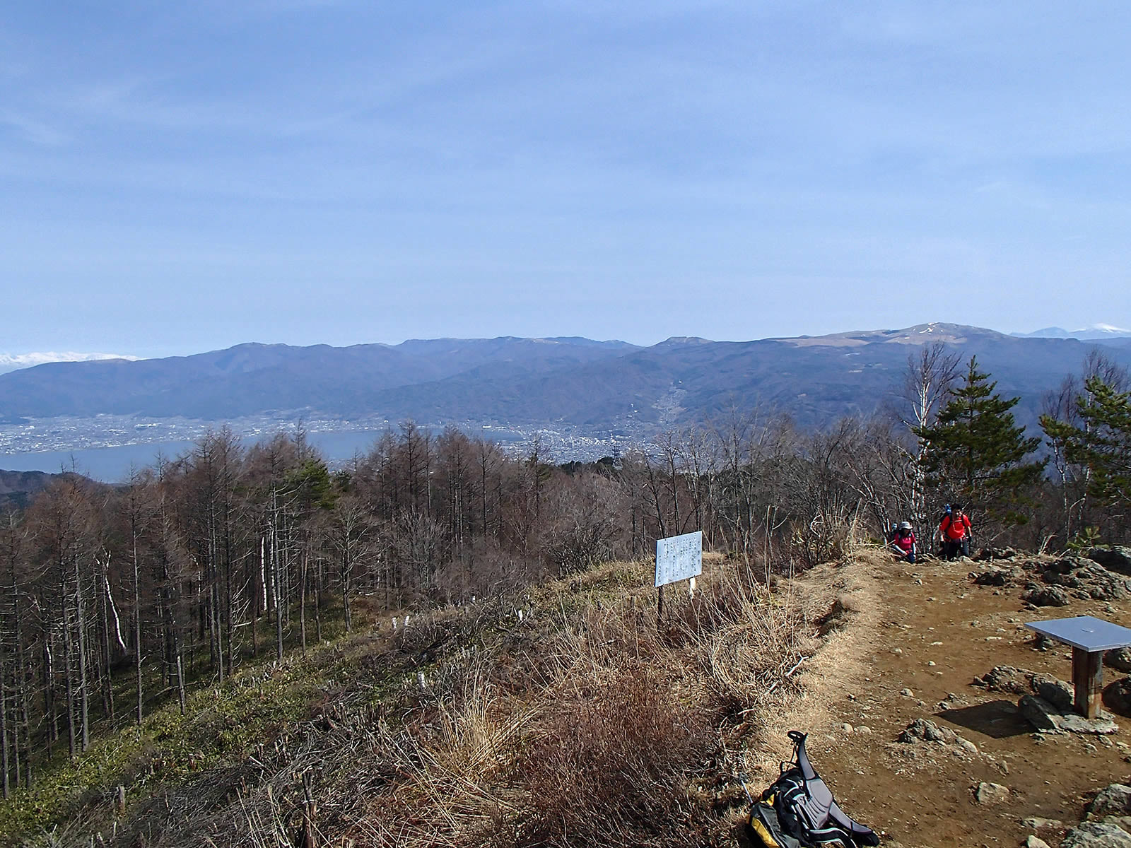 8時38分、杖突峠に到着。杖突峠の駐車場にはもう雪はありません。40台から60台ほど駐められるスペースがありますが、この時間ですでに30台ほど車が駐まっていました。こんな里山にこれほどの人が来るとは本当に驚きですが、低山ながら展望の良さはずば抜けていますので、私も年に何回もおjとずれています。 ちなみに戻ってきたときには車はバス2台を含む40台ほどに増えていました。