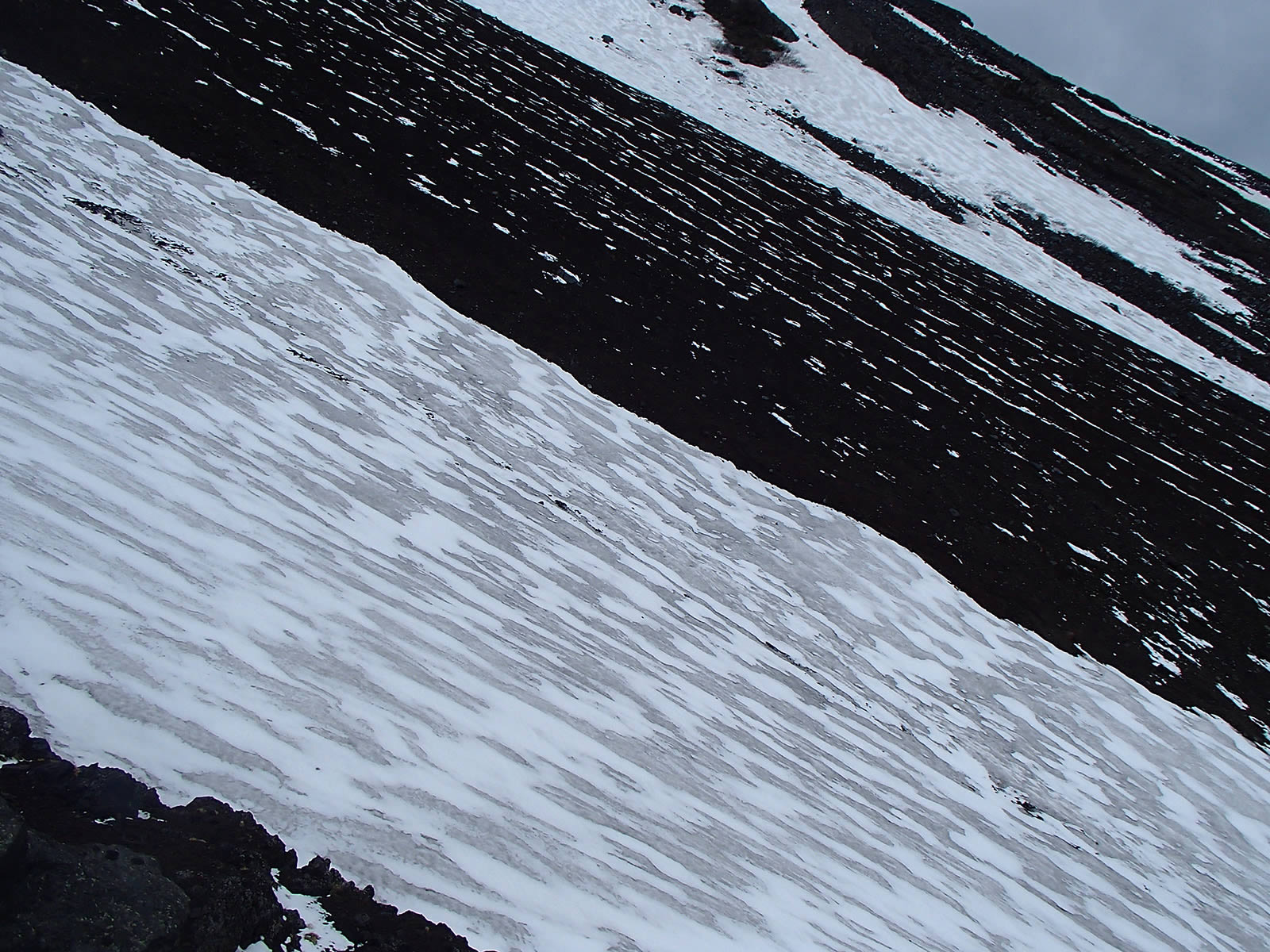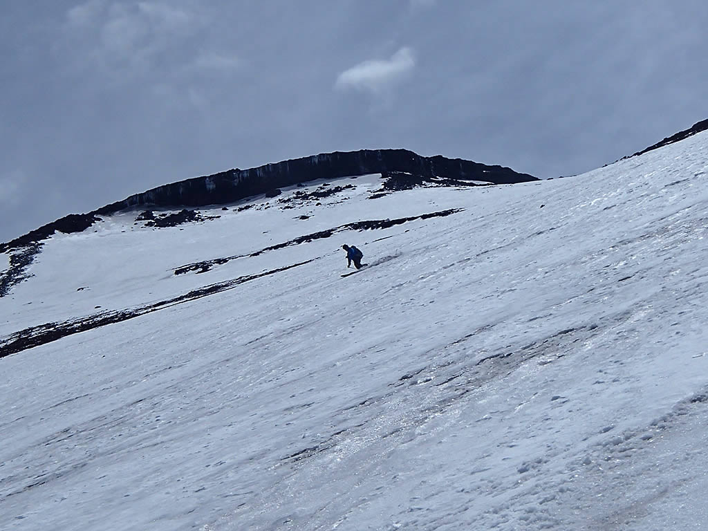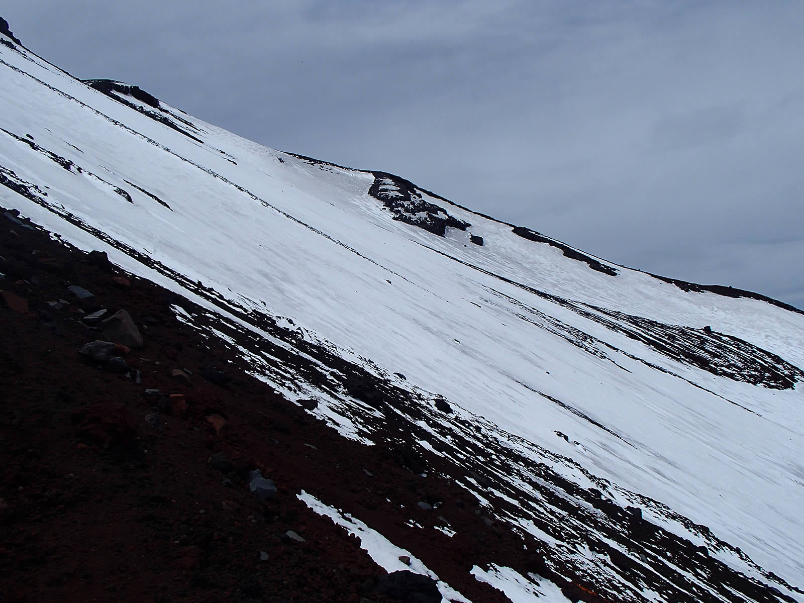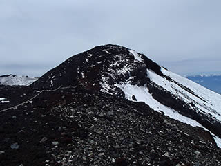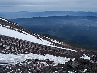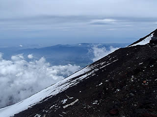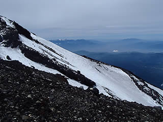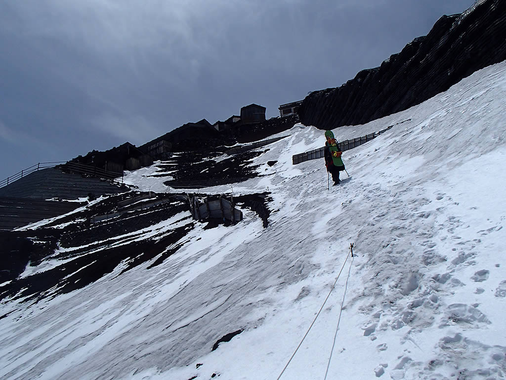 本八合目手前の残雪ですが、日差しで緩んできているのと、新雪が比較的柔らかでしたので、ここもアプローチシューズで注意深く登っていきました。