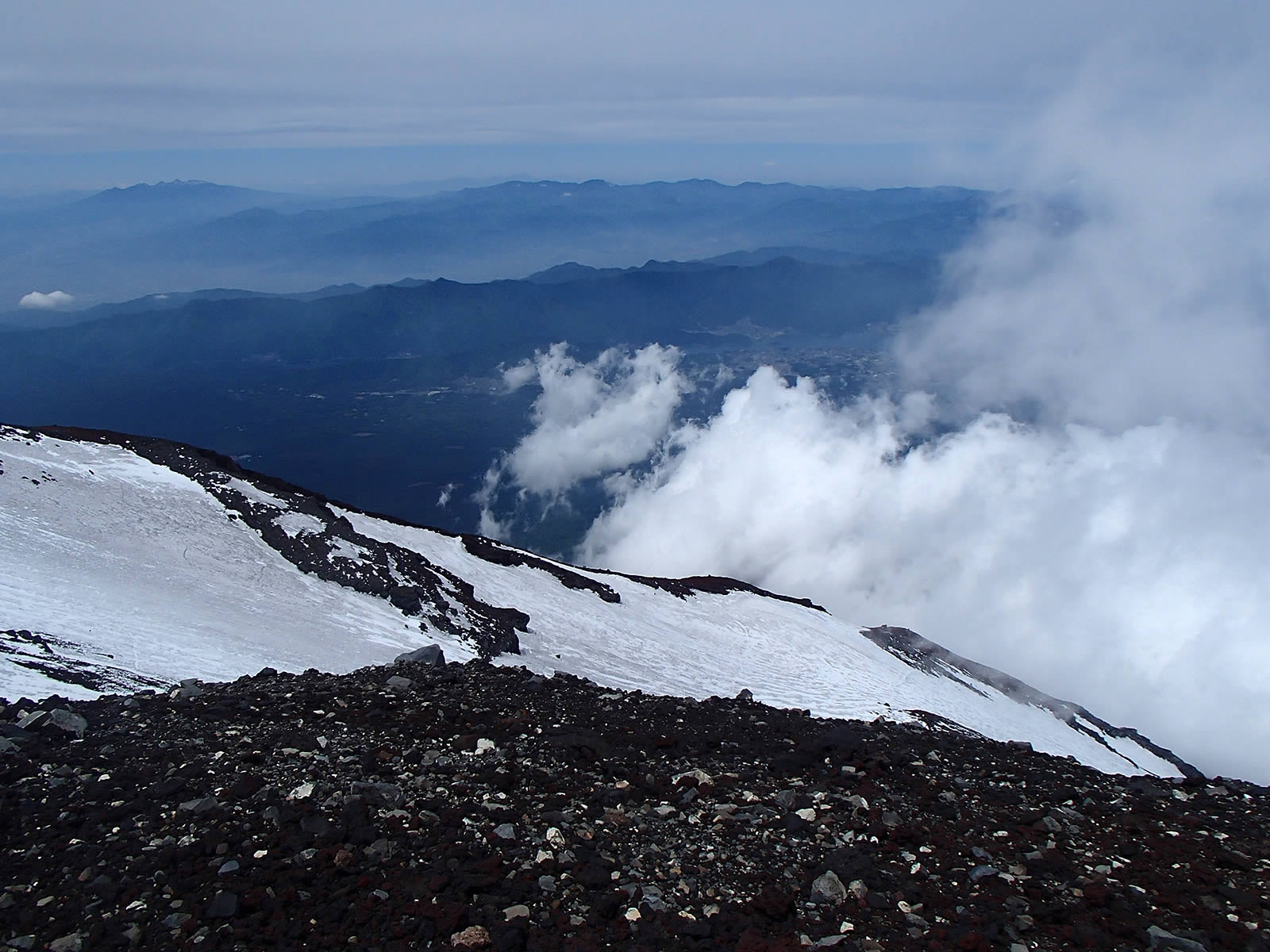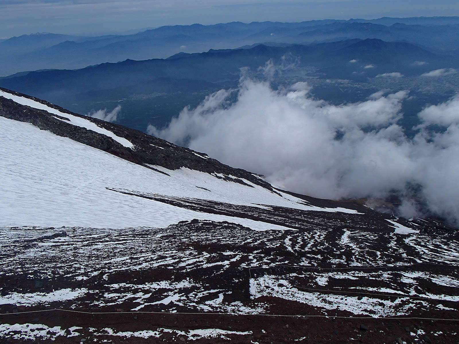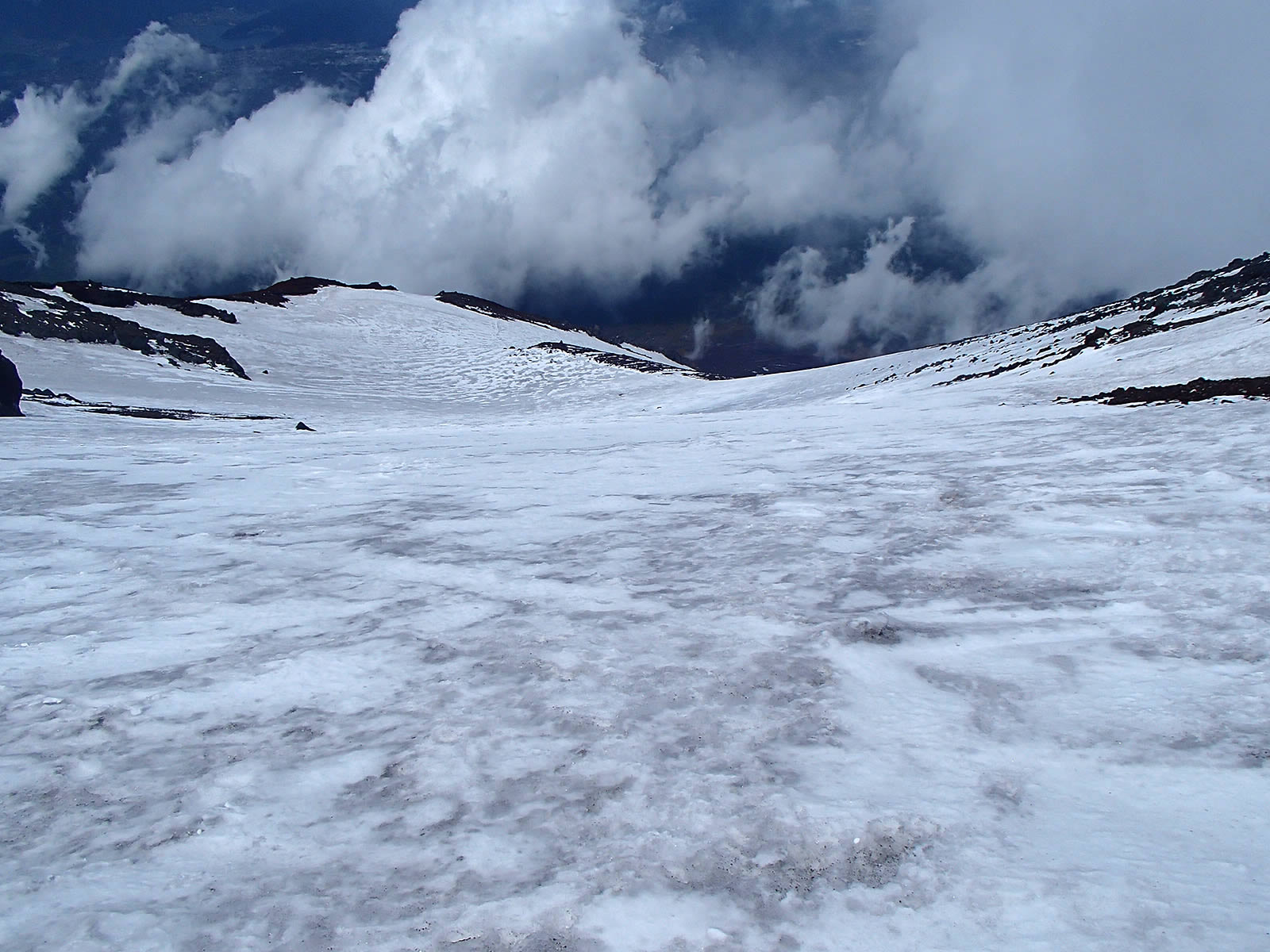 本八合目手前の残雪ですが、日差しで緩んできているのと、新雪が比較的柔らかでしたので、ここもアプローチシューズで注意深く登っていきました。