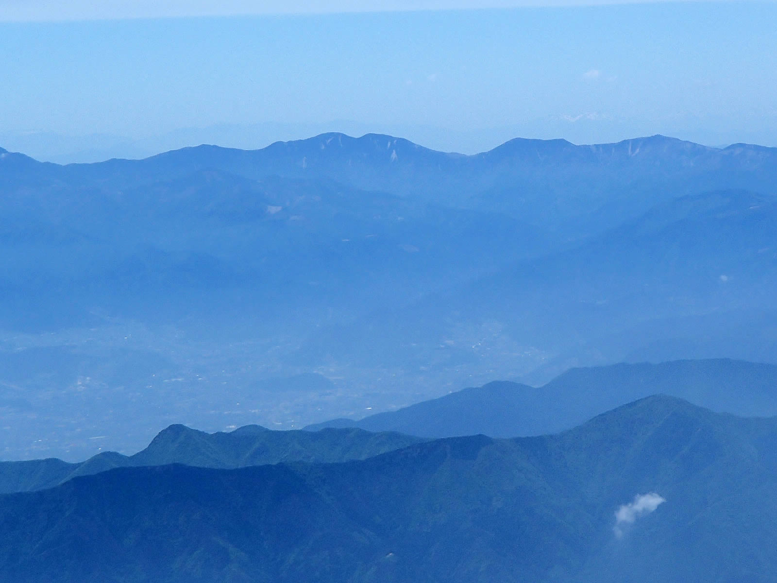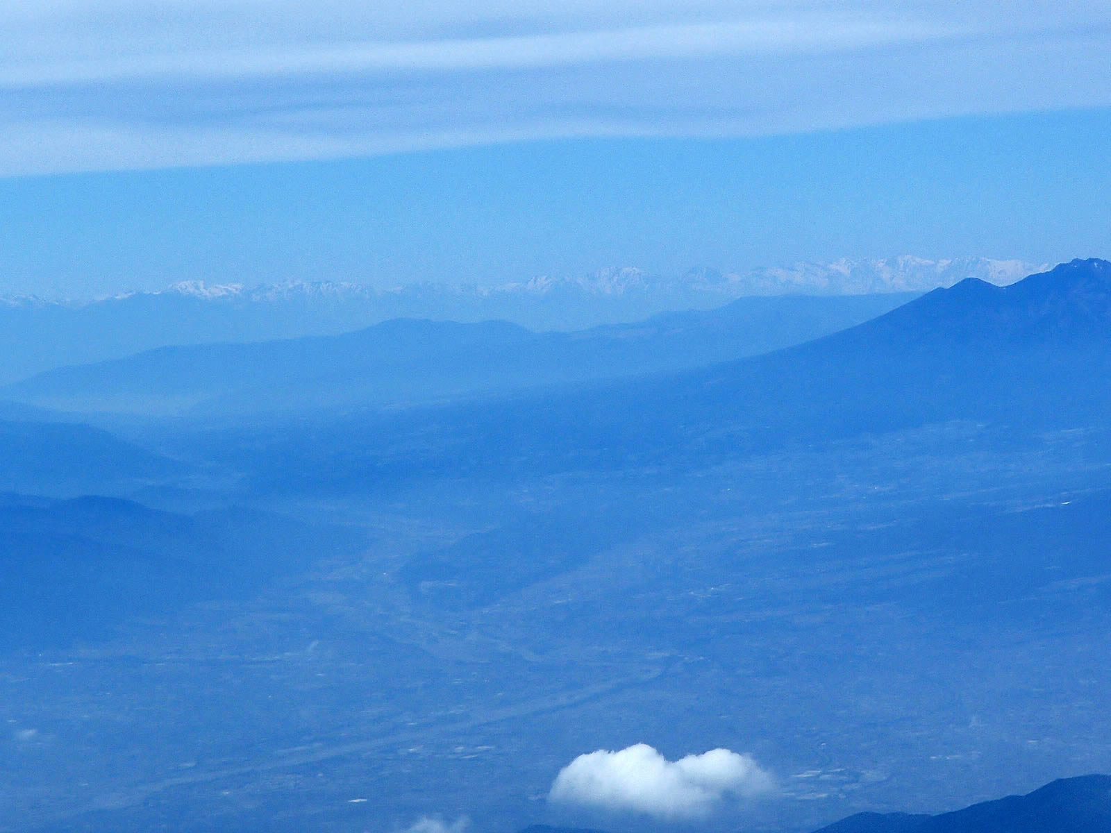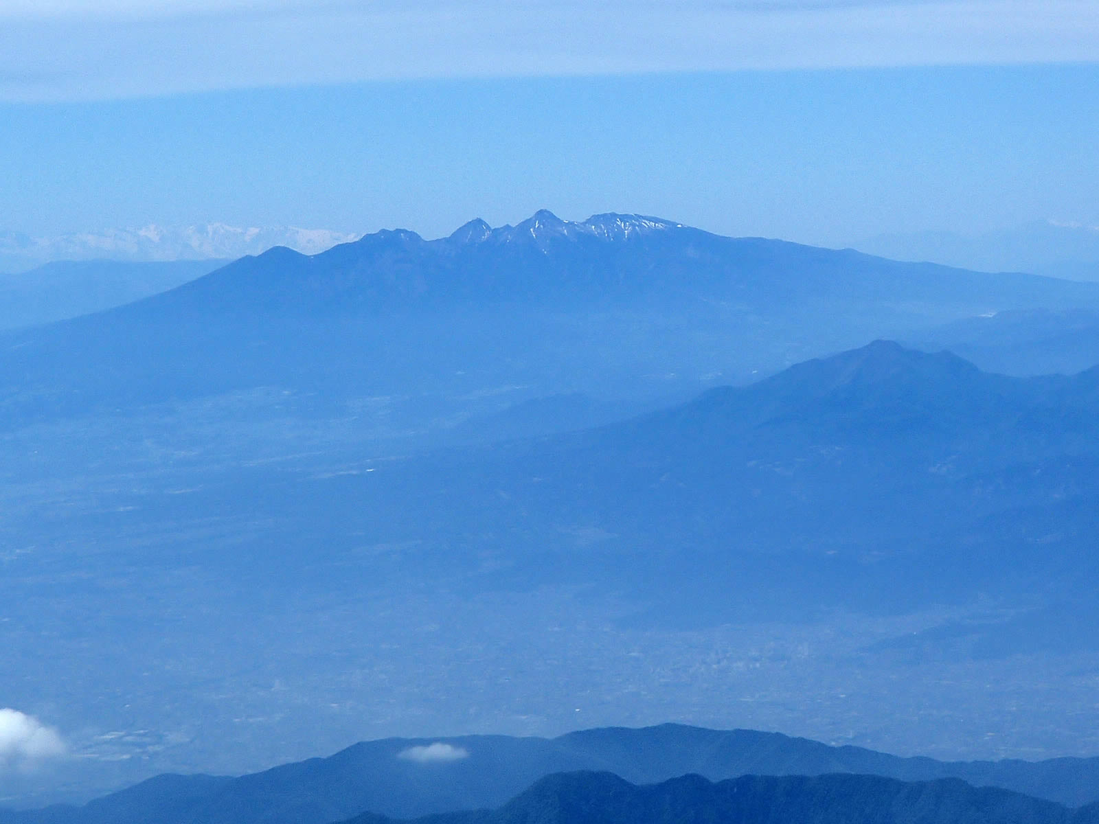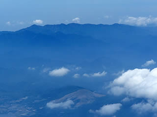 北アルプス北部をズーム。上空に雲が広がっているのはこの辺りだけのようで、長野県内はどうやらすばらしい快晴のようです。少しくやしい(^^;。