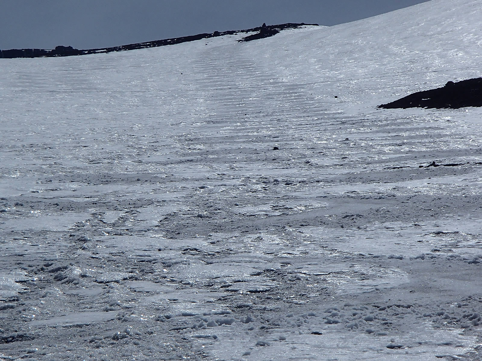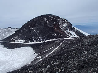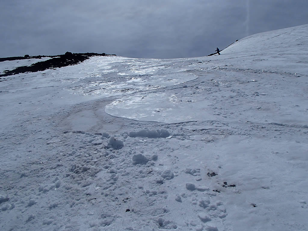 山頂手前に少しですが、雪渓上の歩きの部分がありました。雪はクラストしていなくて表面は柔らかでしたので、アプローチシューズのまま登っていきましたが、この辺りでアイゼンを装着した方が楽でした(^^;。山頂手前では表面が薄く緩んだその下はアイスバーンの様な堅い雪になり、アプローチシューズでは蹴り込んで歩くことが出来ず、慎重な歩きを強いられましたので。