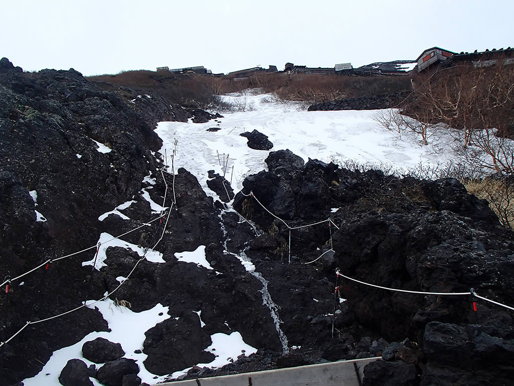 六合目に向かう登山道の途中で登山道をふさぐ残雪がありましたが、ここもぎりぎり地面の上を歩けました。