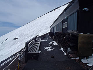 七合目の小屋群をズーム。小屋横の雪渓もずいぶんと小さくなりました。