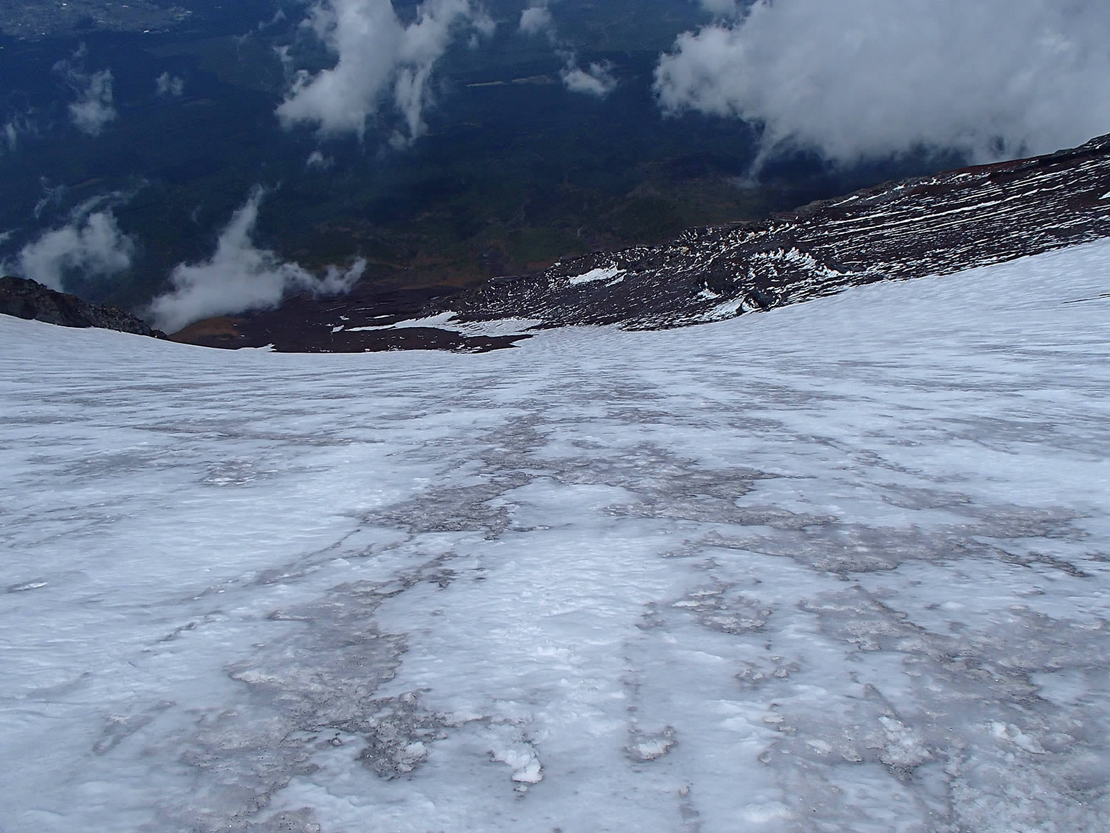次の3枚は吉田大沢下部の様子。特に手前側の雪渓は中間でだいぶ石、岩が目立ってきています。