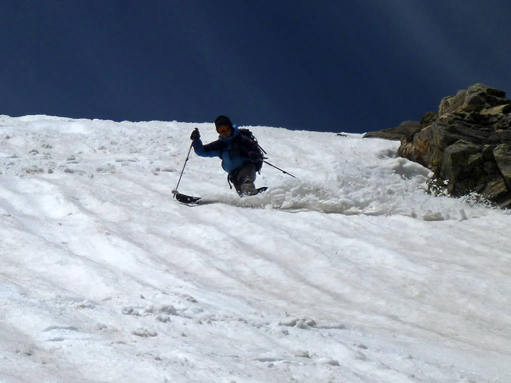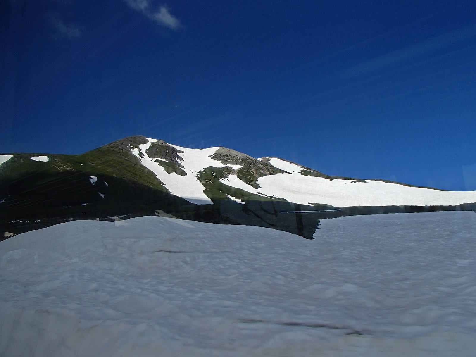 次の写真は下る途中で撮影したものですが、最初はツアーコースへ下る斜面の様子。この斜面はまだ滑るほどの雪が残っていますね。