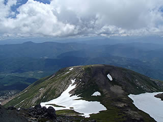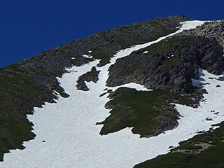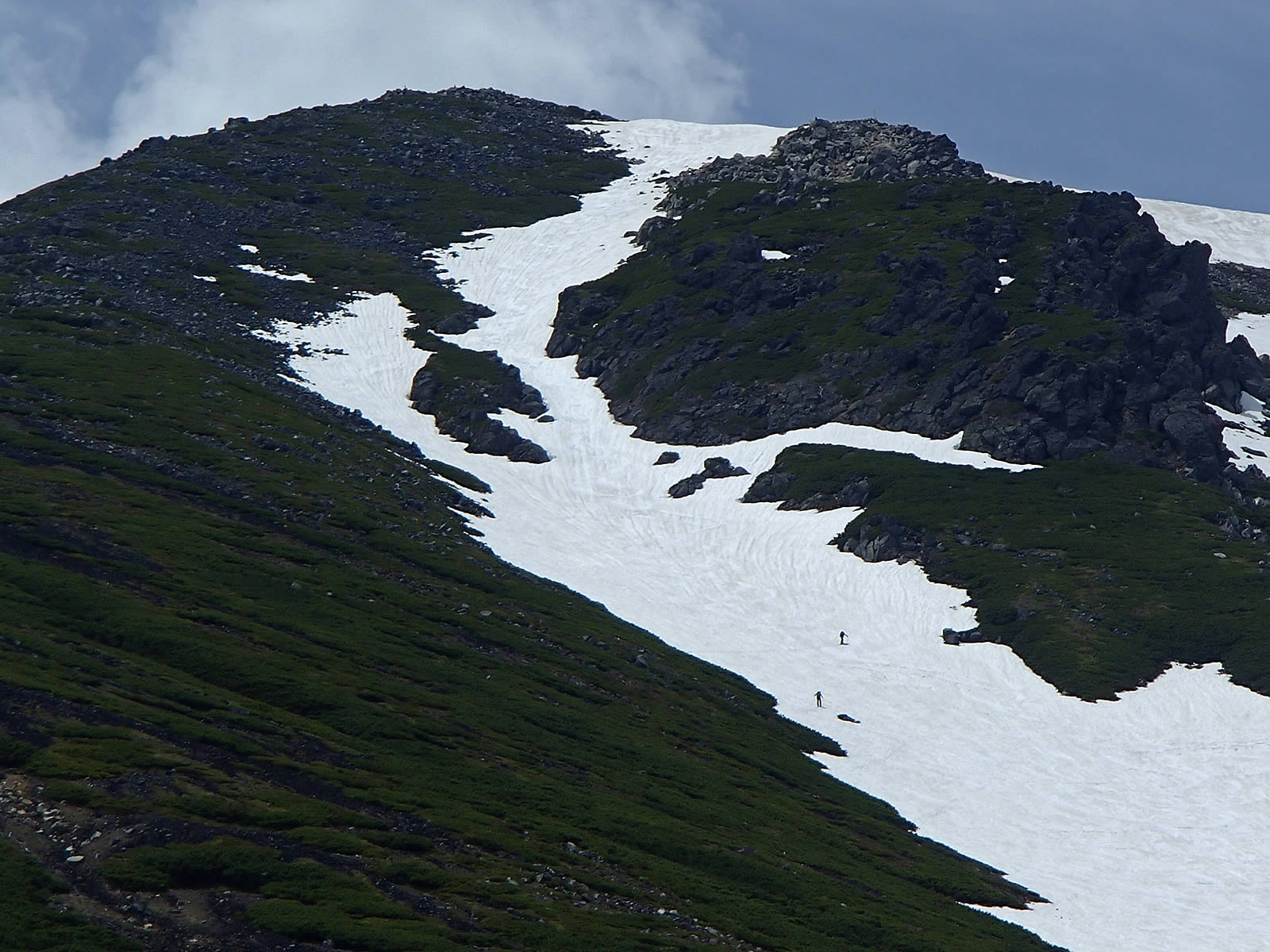剣ヶ峰と蚕玉岳の間の斜面をズーム。中間で岩が目立ち始めています。この斜面もあと1週間から2週間が賞味期限と思われます。