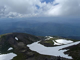 朝日岳と蚕玉岳のコルに出ました。朝日岳の稜線の雪もだいぶ溶けました。