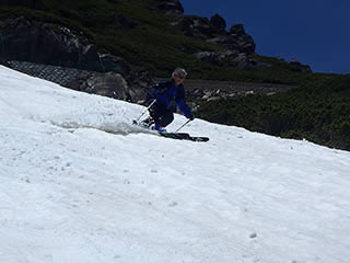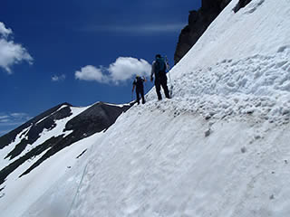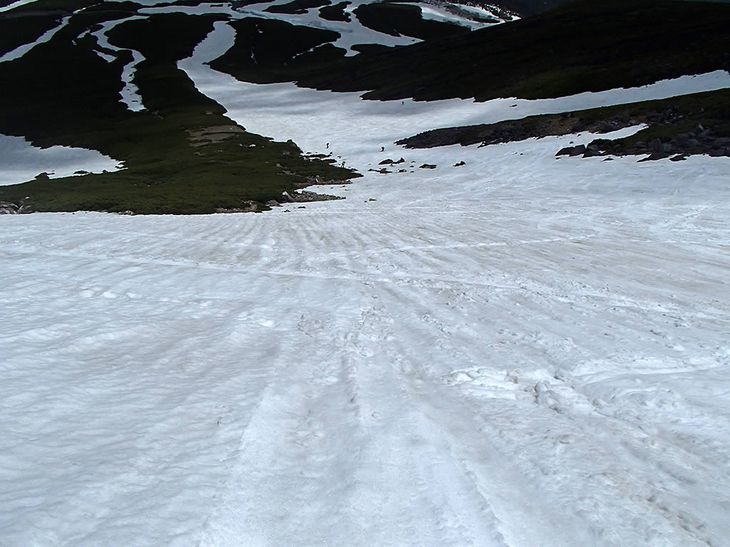 ここから滑り始めます。ちなみに畳平から来た人が肩の小屋に向かう場合、この急なトラバースを歩くことになります。ステップが付いていますが、高所恐怖症の人は足がすくんでしまうかも(^^;。