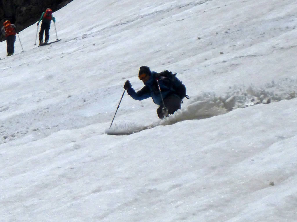 剣ヶ峰直下のシュートをズーム。途中で岩が目立ち始めていまして、このシュートを滑ることが出来るのは今週末が最後になりそうです。ただ狭いのと岩が多いので、今回は蚕玉岳側の斜面を滑り降りました。