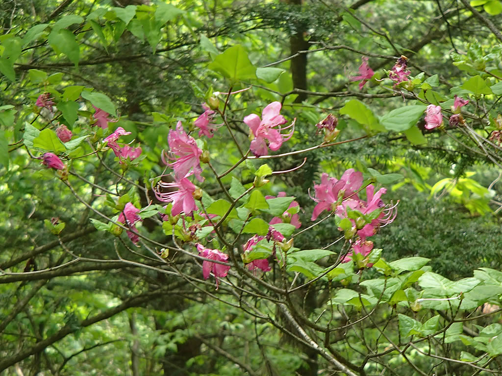 この色がピンク色のツツジは中腹から山頂にかけて所々で見かけましたが、いずれも終了という感じでした。おそらく1週間前なら、中腹まではオレンジ色のツツジが、中腹から上ではピンク色のツツジがちょうど満開で楽しめたかも知れません。
