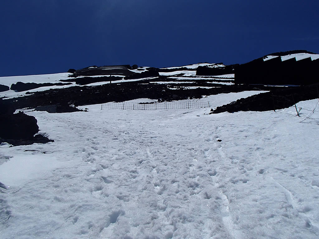 ただ登る毎にだんだんと雪が堅めになってきて、ざらめではなくなり、蹴り込めば雪がブロック状に割れるだけになってきましたので、予定通り13時22分、上に見える鳥居と御来光館の中間あたりで登るのを止め、足場を作ってそこで滑る準備をします。