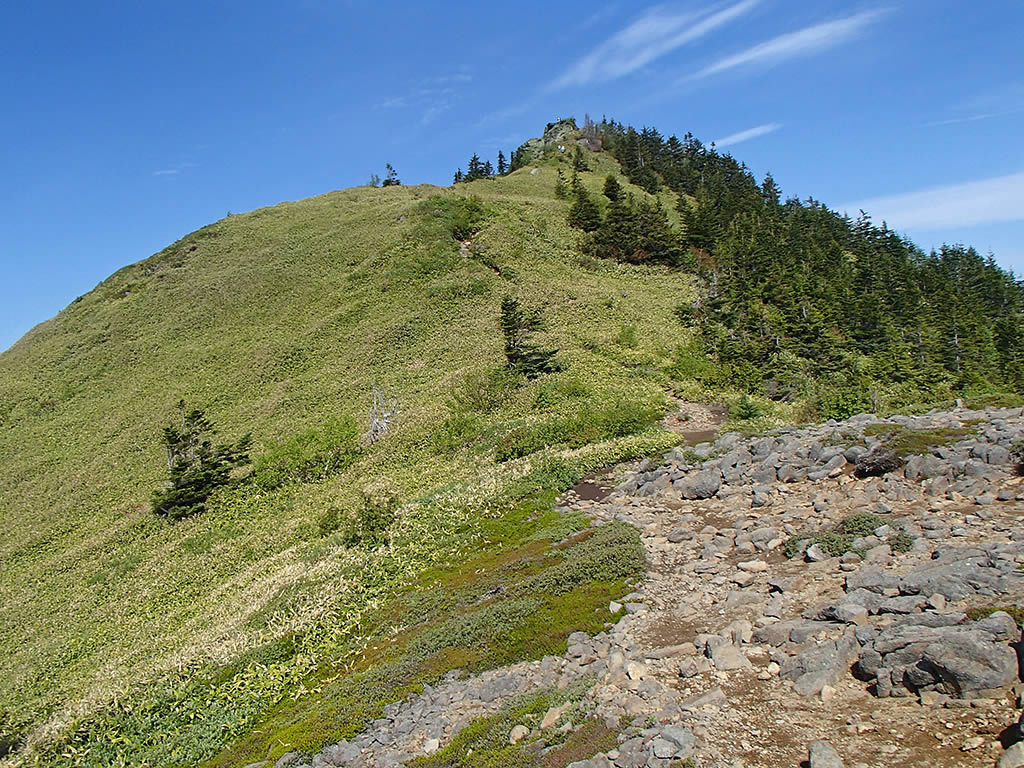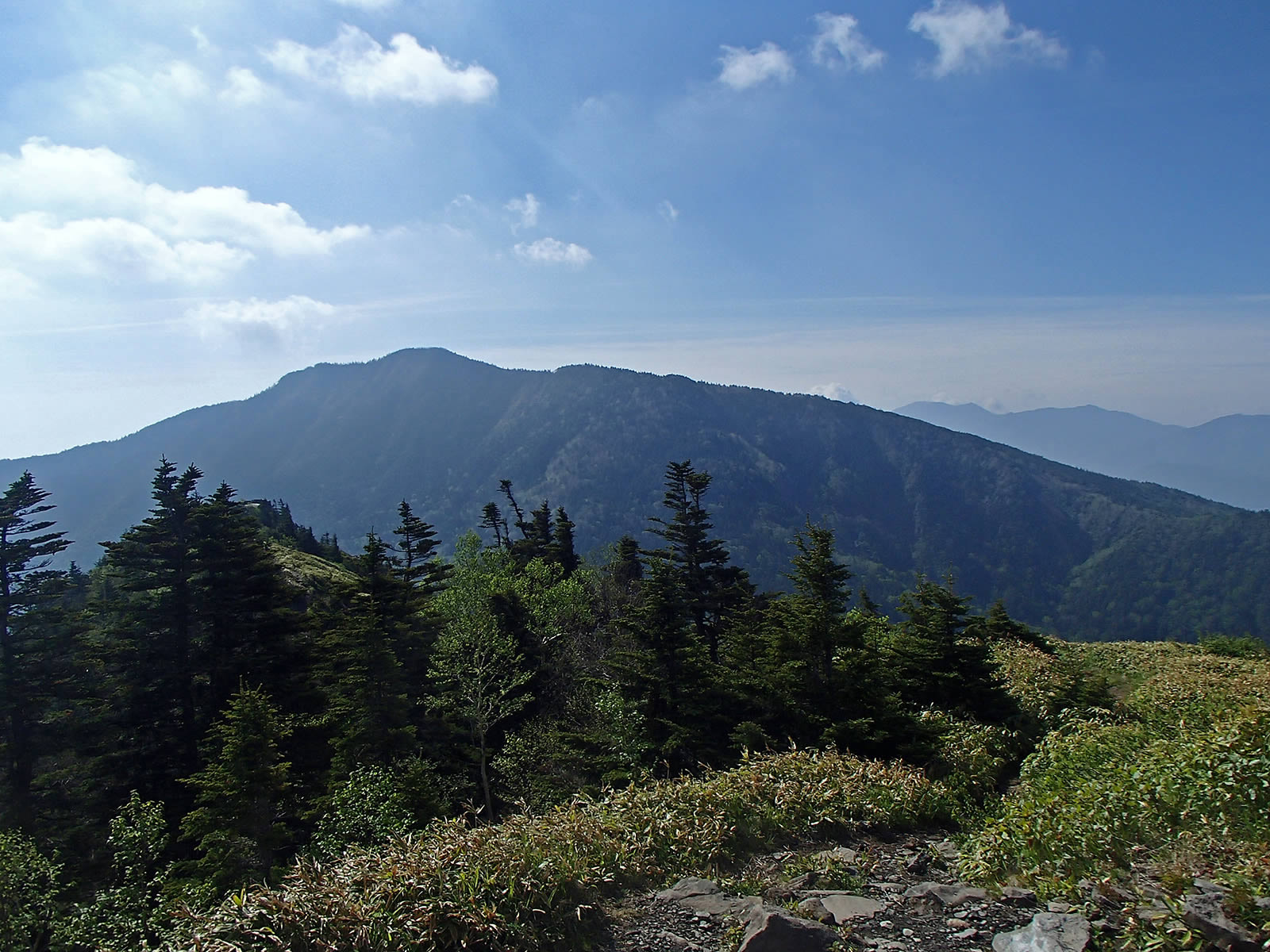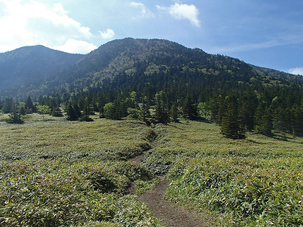 9時3分、尾根上に出ました。菅平牧場からの登山道に合流します。