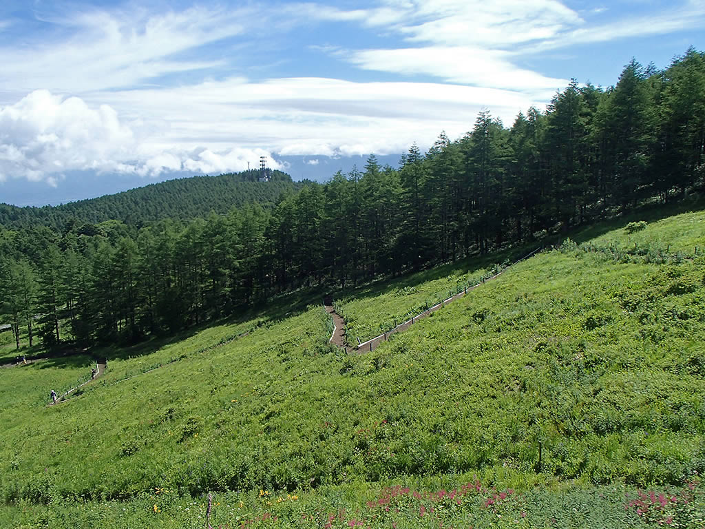 入笠湿原を振り返ります。まだ富士見パノラマのゴンドラが動いていないので人は少ないです。