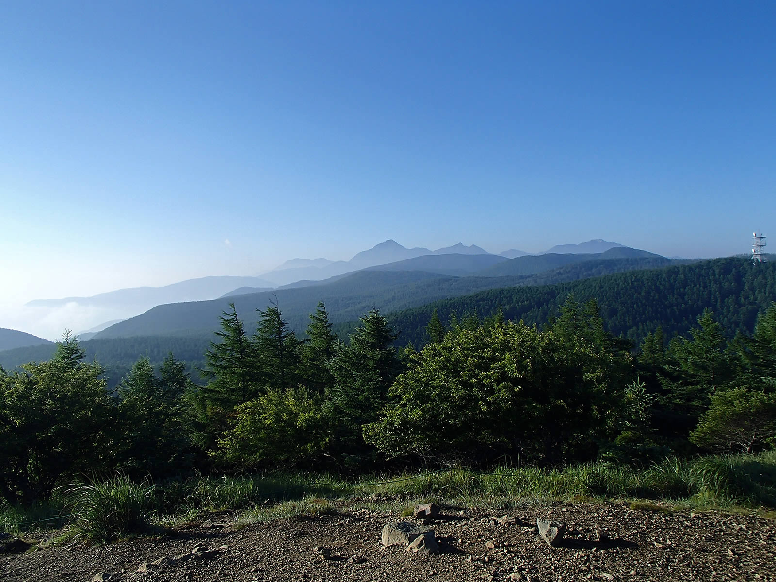 6時22分、入笠山山頂に到着。山頂には10数人ほどの人がいてびっくりしました。多くは軽装なので、どうやら山小屋に泊まっていた人たちが朝食前に散歩に登ってきた感じでした。