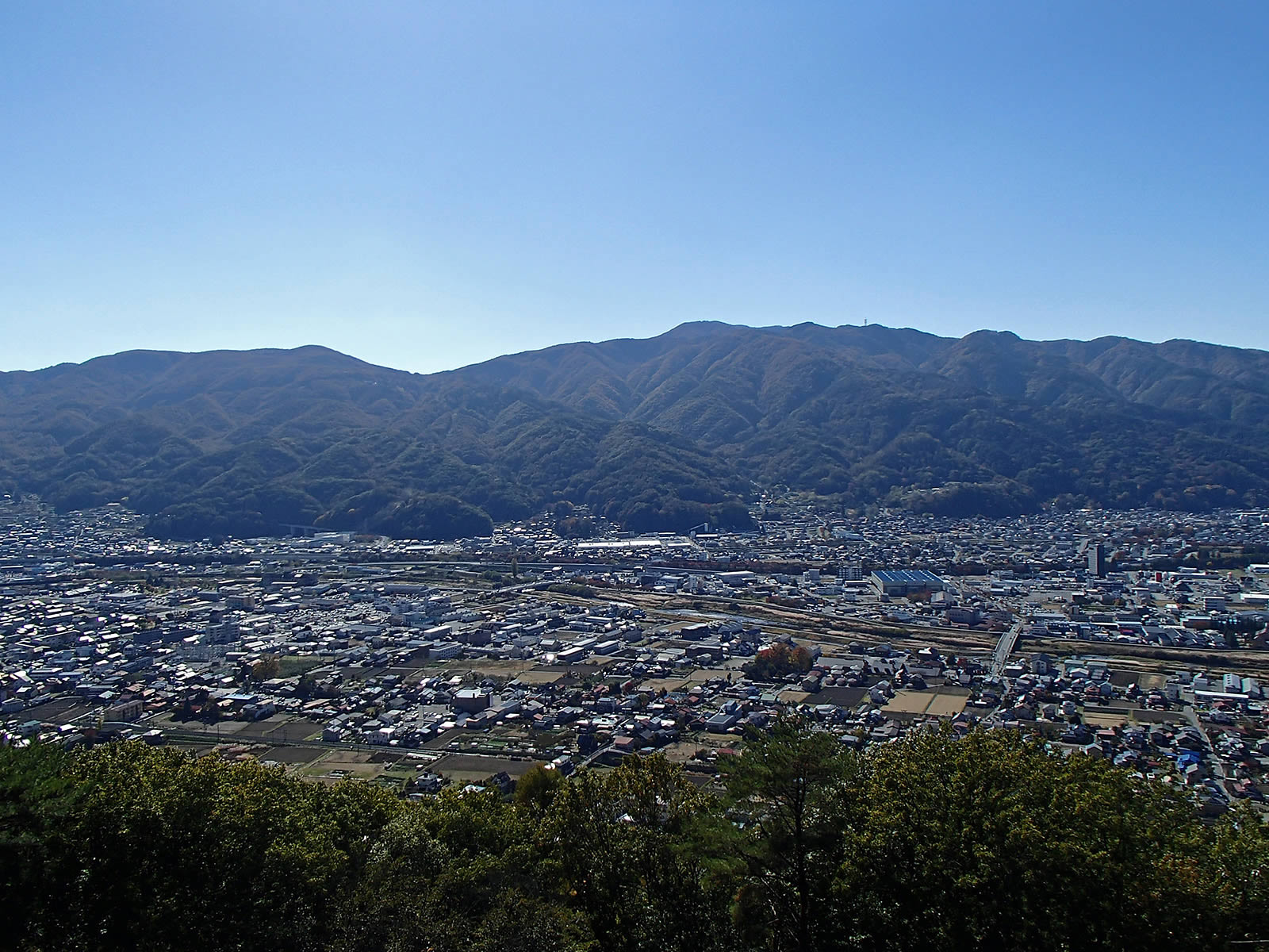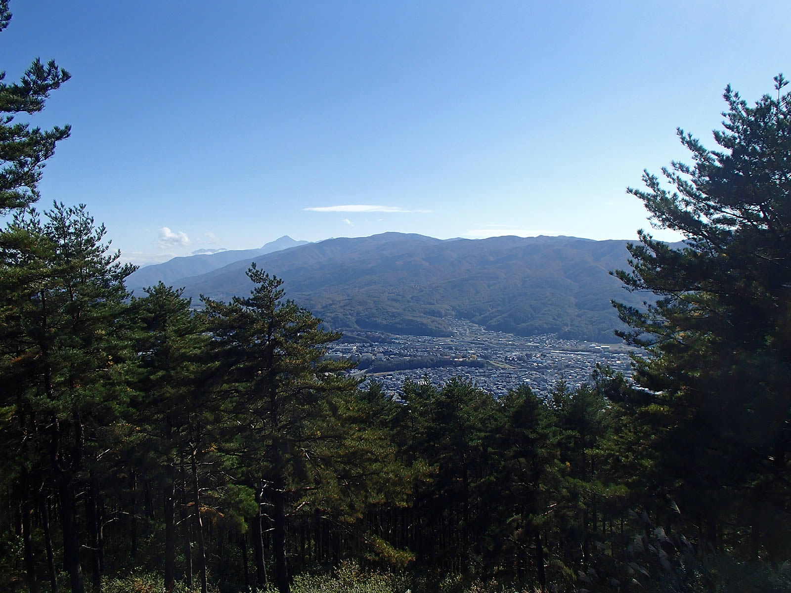 ちょうど正面に守屋山、そして麓の諏訪大社上社が見えます。