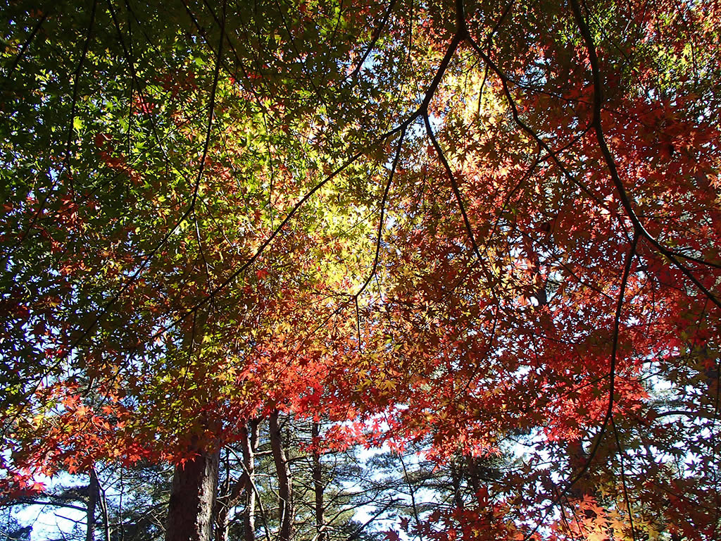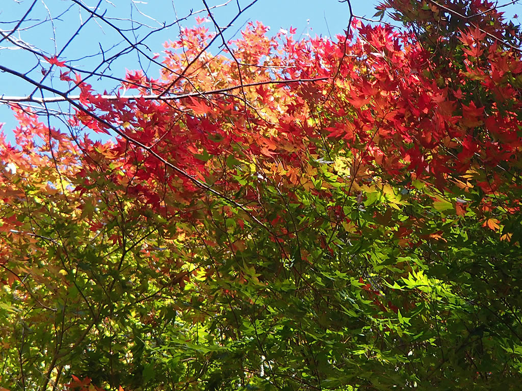 東峰に向かう途中に2本の大きなもみじの木があります。ここに来る度にその紅葉がとても楽しみでしたが、今回はさすがにまだ色付き始めの段階でした。