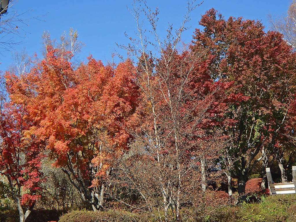 展望台脇に3本並んでいるもみじ。もうすぐ赤、まだほとんど緑、色付き始めと紅葉の進み具合もいつも通りにばらばらでした(^^)。