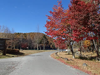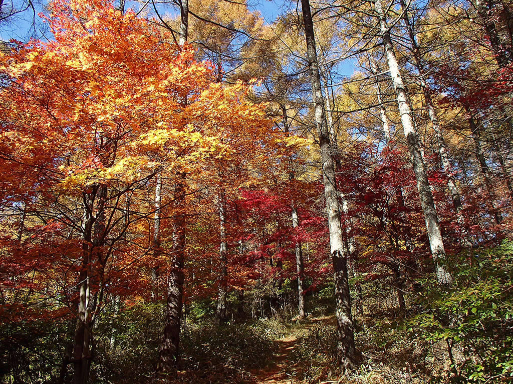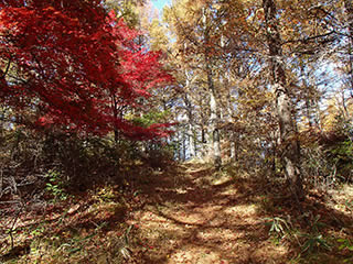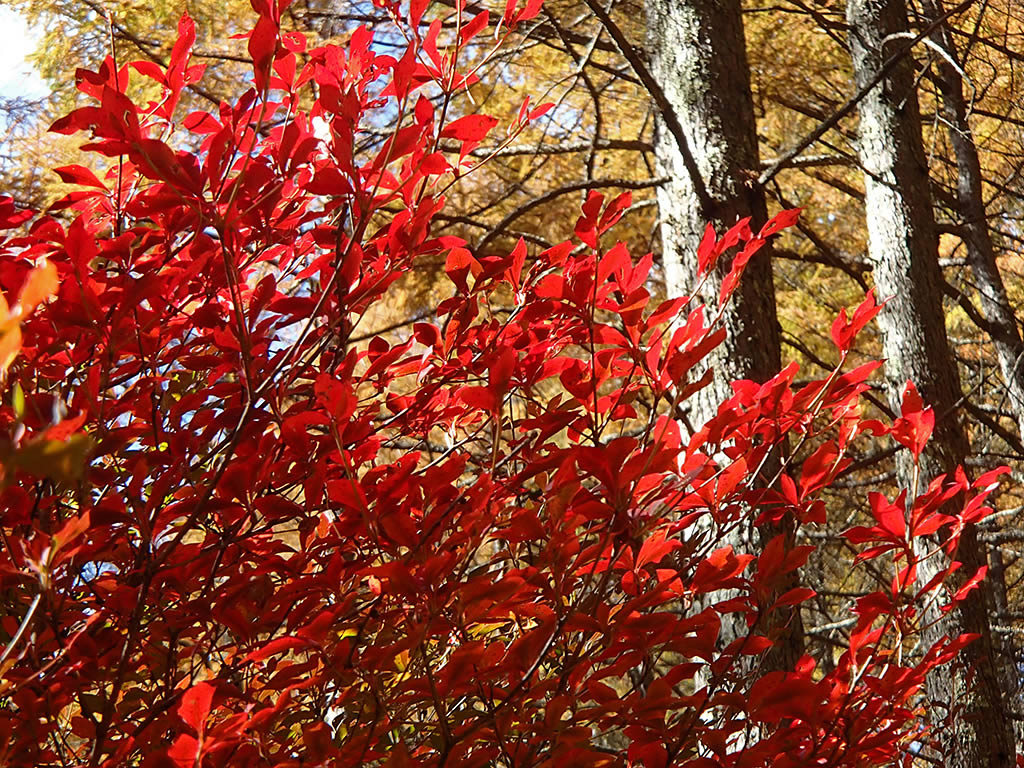 カラマツ林に入ると、正面に紅葉したもみじが見えてきます。