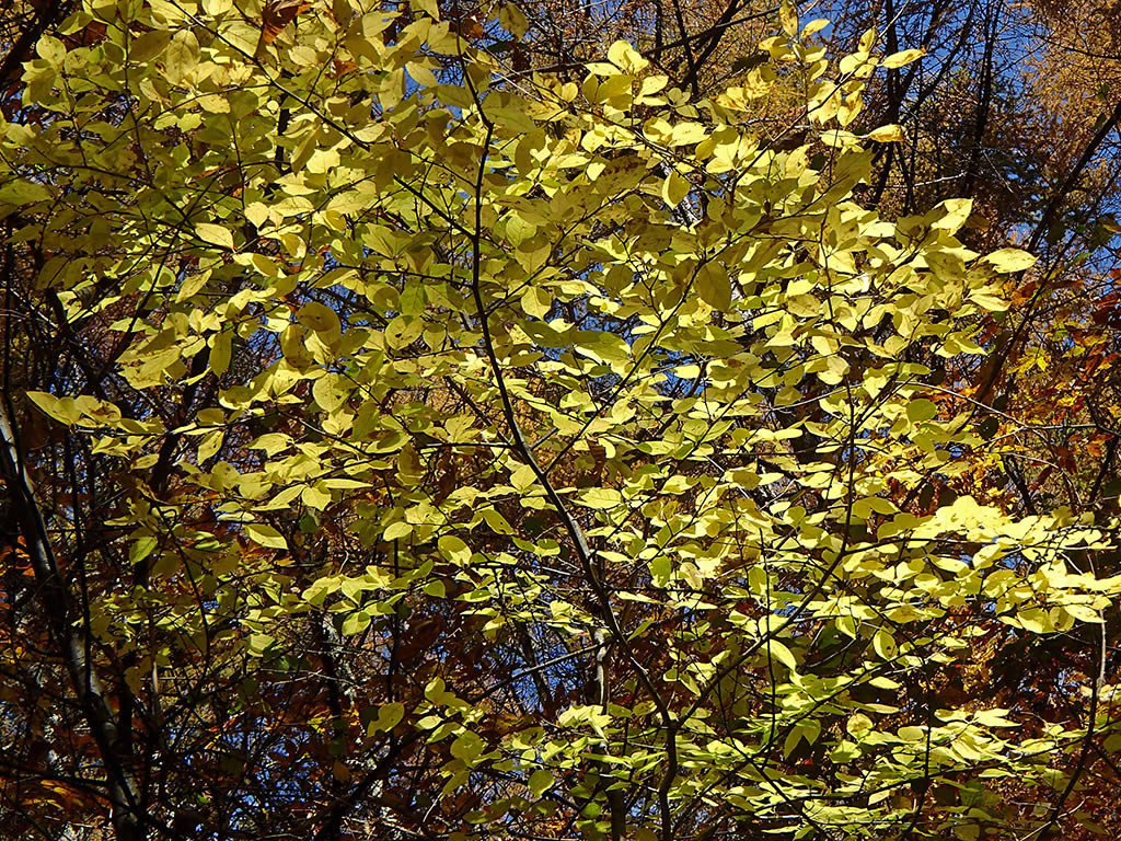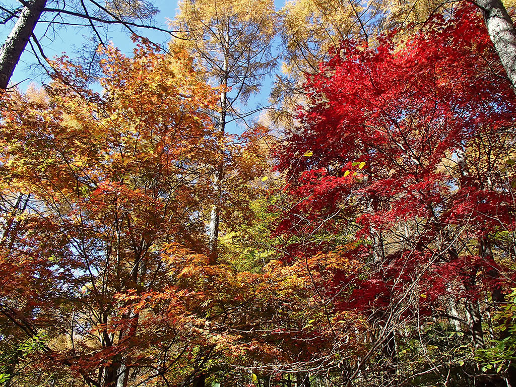 このルート沿いにはもみじが少ないですが、でも黄色やダイダイの紅葉が多く、楽しめました。もちろん上を見上げれば常に黄金色をしたカラマツの見事な黄葉がありました。