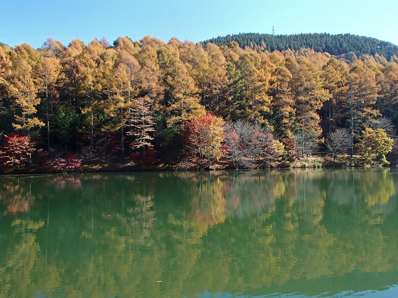 いずみ湖のあたりでカラマツの黄葉、もみじの紅葉共に見頃になっています。