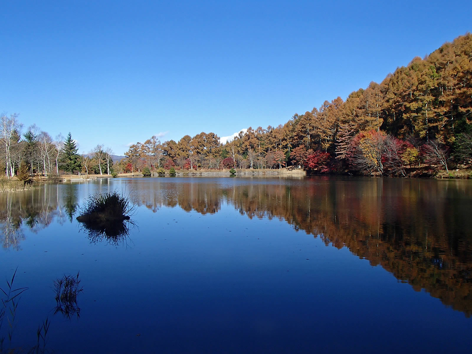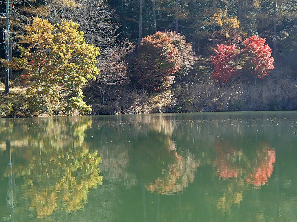 奥に進むと風がかなり弱くなり、水面がまるで鏡のようになっていました(^^)。カラマツの黄葉はまさにピーク、もみじの紅葉はピーク少し前という感じでしょうか。