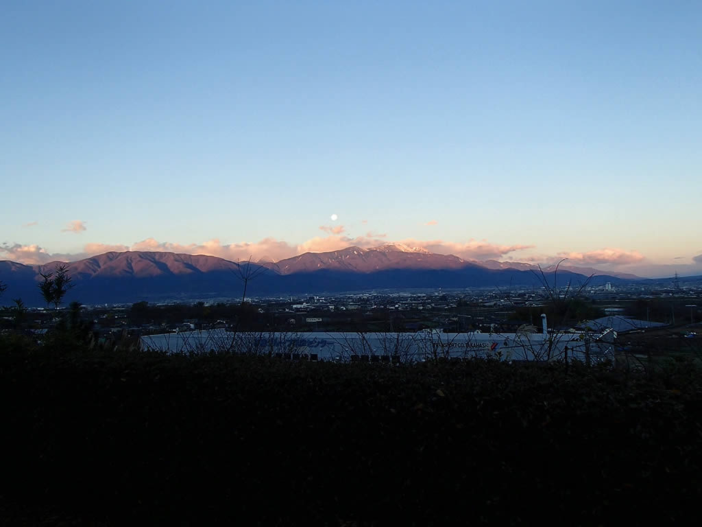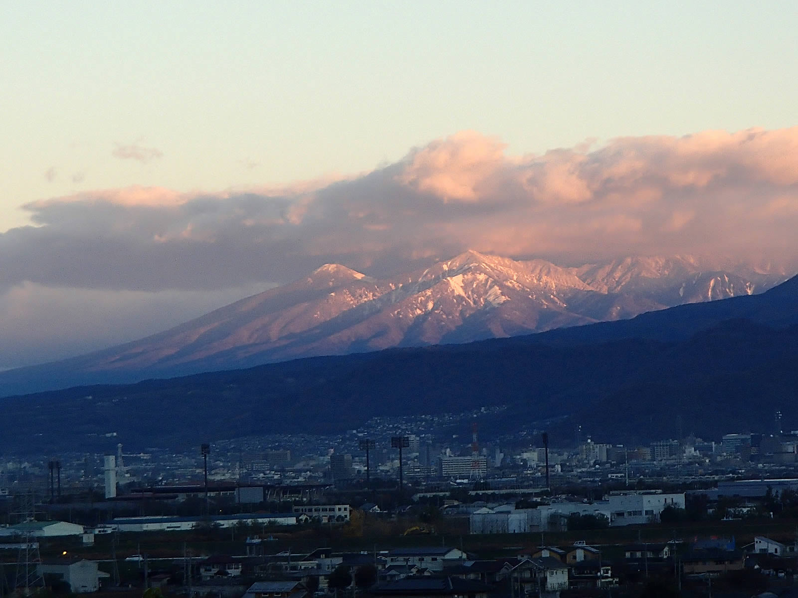 八ヶ岳は雪雲がかかっていますが、赤く染まっています。