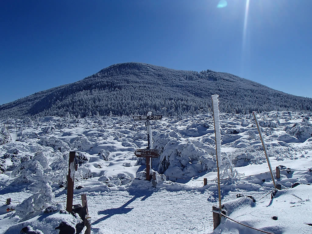 ロープウェイ山頂駅から50分で北横岳南峰に到着。さすがに山頂はそれなりの風があって極寒です。