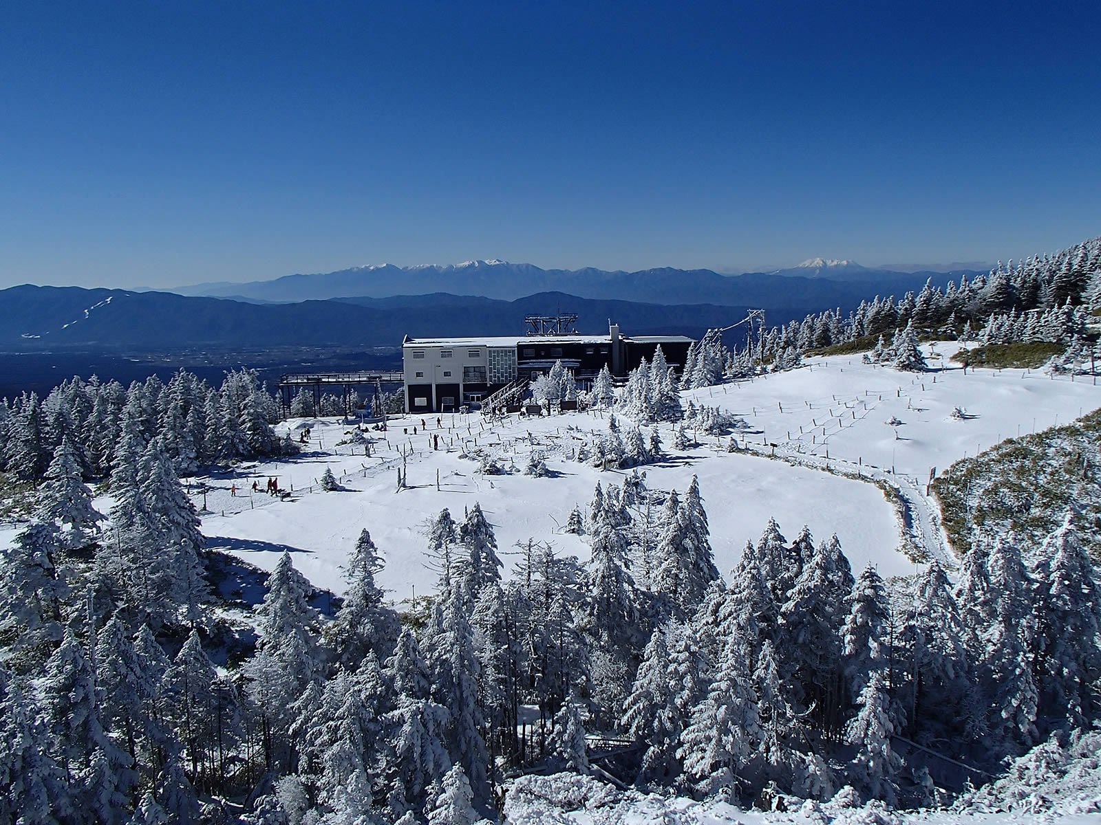 ロープウェイの山頂駅を出ると素晴らしい景色が広がっていました(^^)。駅の中にテレマークスキーの板は置かせてもらい、つぼ足で北横岳山頂に向かいます。