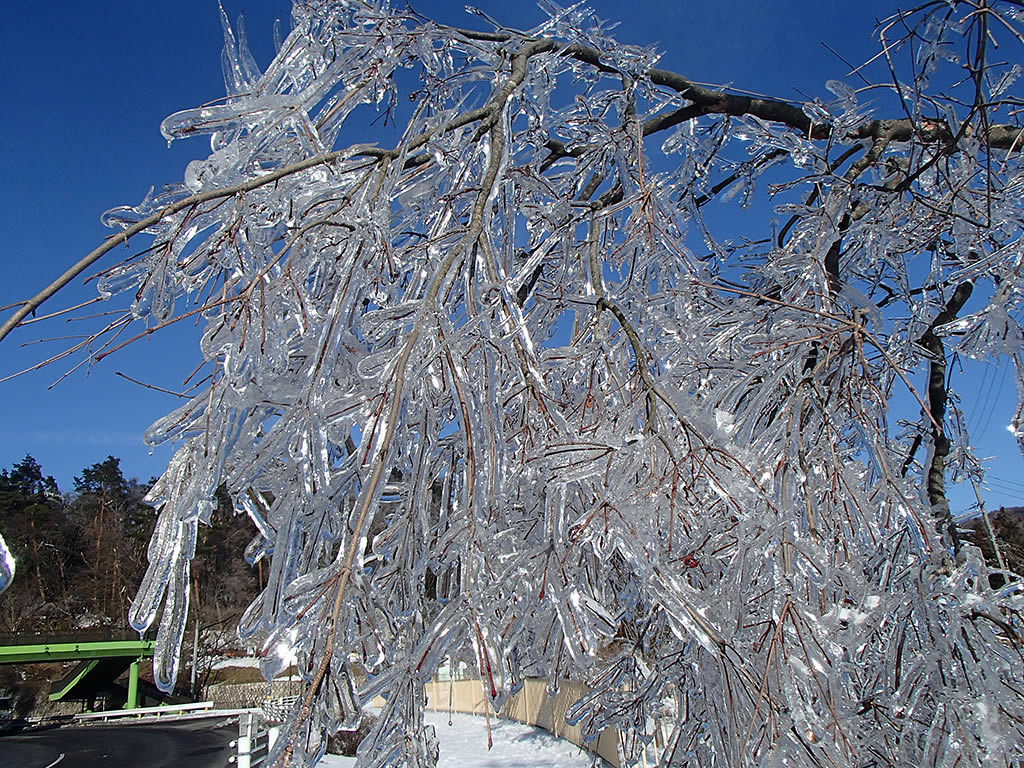 でも良く考えてみたら、おそらくつららが出来たあと、重みで枝が下がったのでこうなったのでしょうね(^^;。実際に折れた枝も散乱していましたし、折れた木もあちこちにありました。