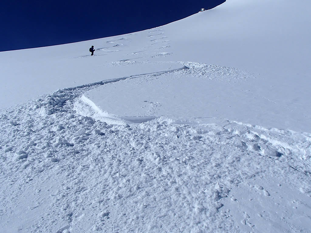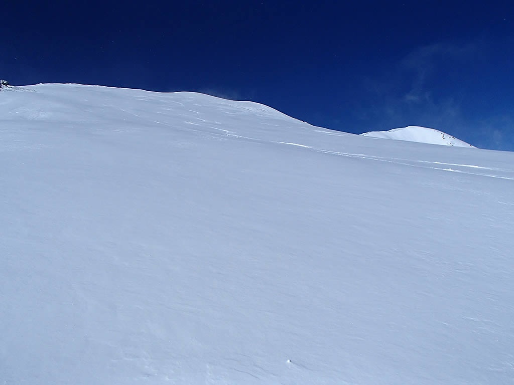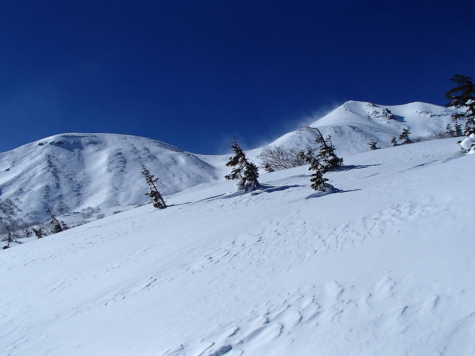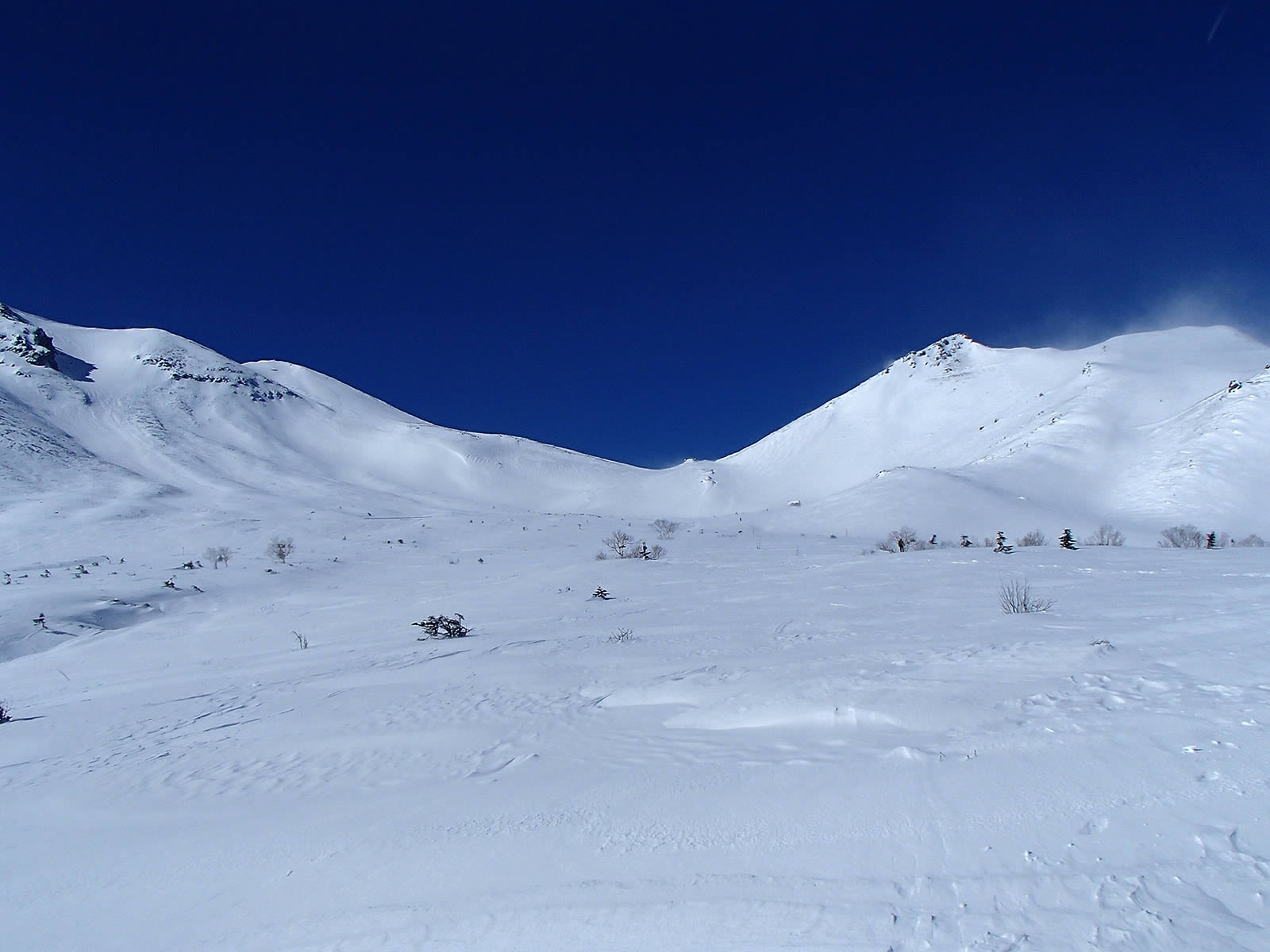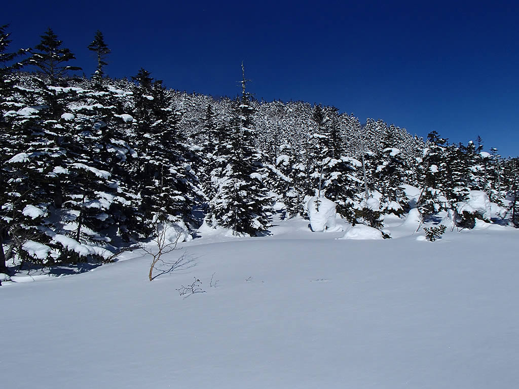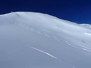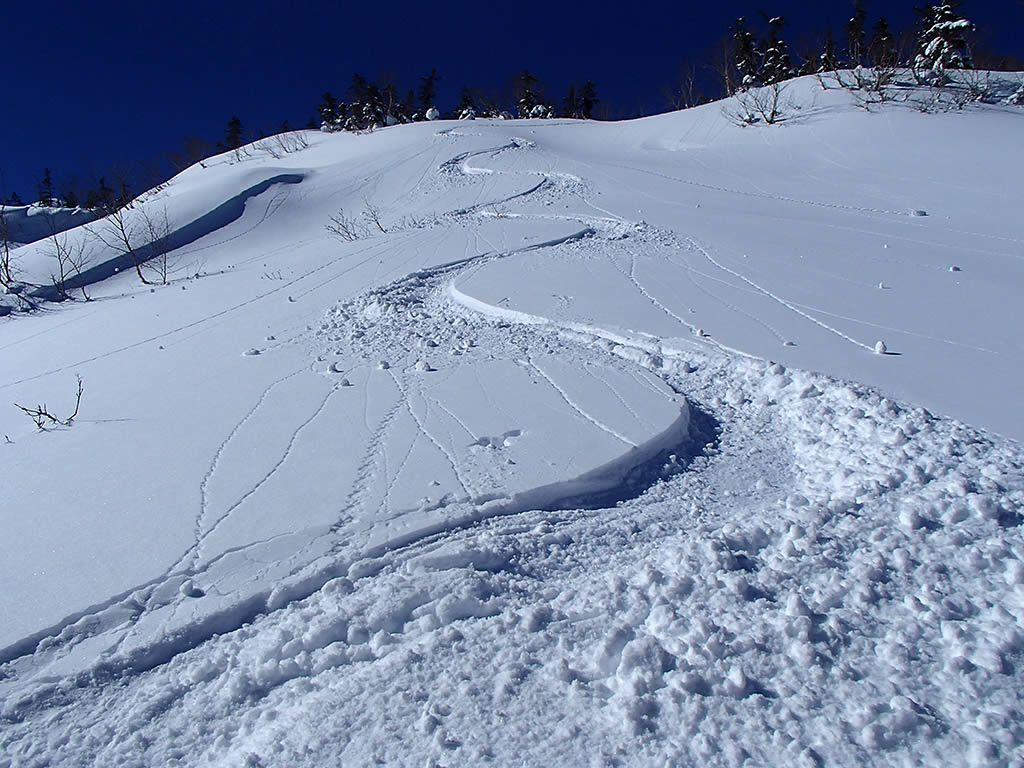 この斜面の上部側はかなり急斜面になり、雪崩の危険がありますので要注意です。