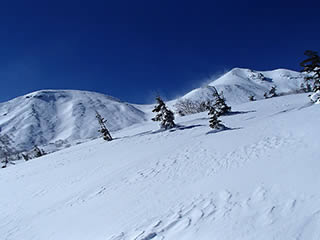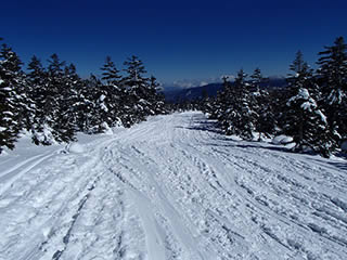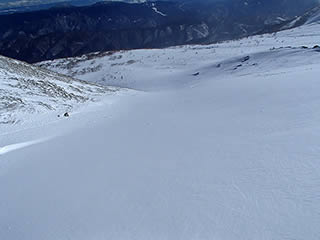 位ヶ原から下る急斜面は大方ぎだぎだになっていましたので、一番西側のこの斜面を滑ってみます。