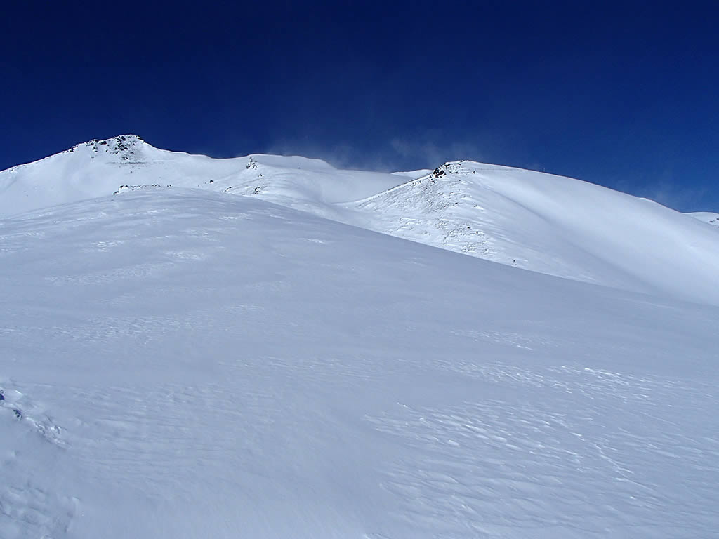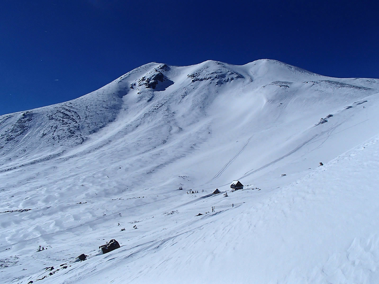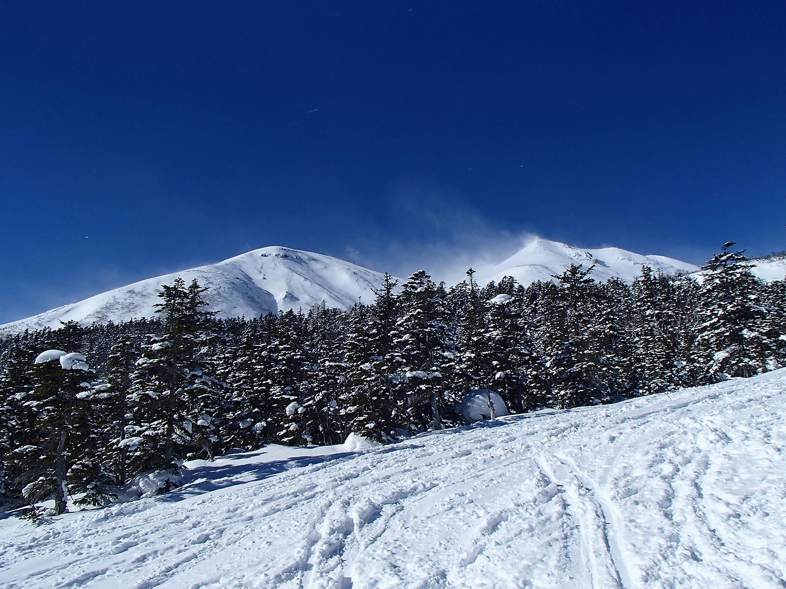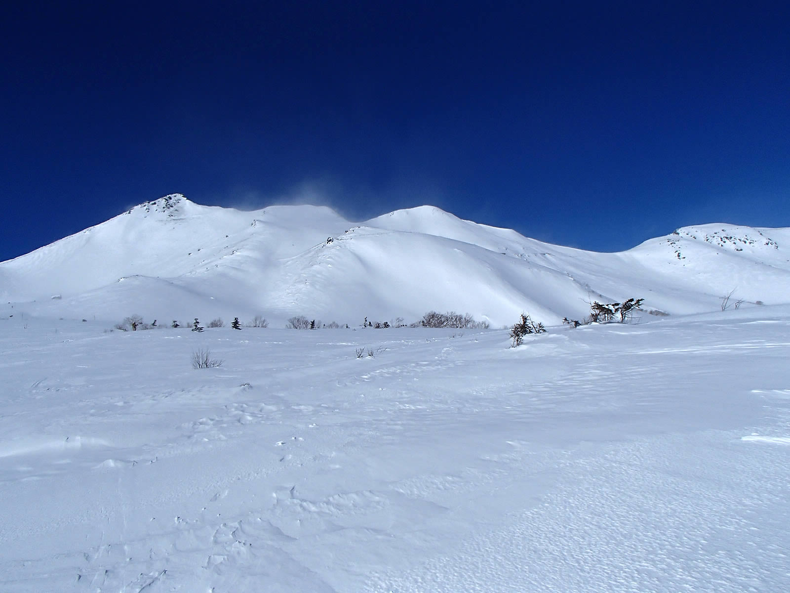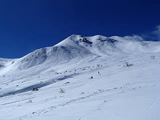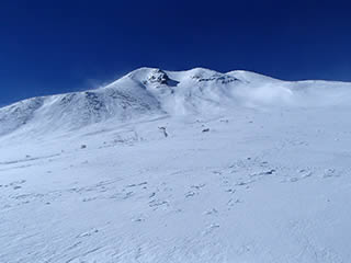剣ヶ峰をズーム。今日は山頂から滑れるのではと思っていましたが、新雪はあまり多くなさそうな感じです。厳冬期の剣ヶ峰は中々雪が増えませんね。
