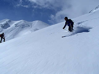 その後はツアーコースを滑り降りていきますが、パウダーがほとんど残っていないので、結構足にきます(^^;。