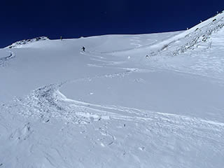 ただふわふわの新雪の下は堅いバーンがありますので、最上部を登るのに苦労しているようです。