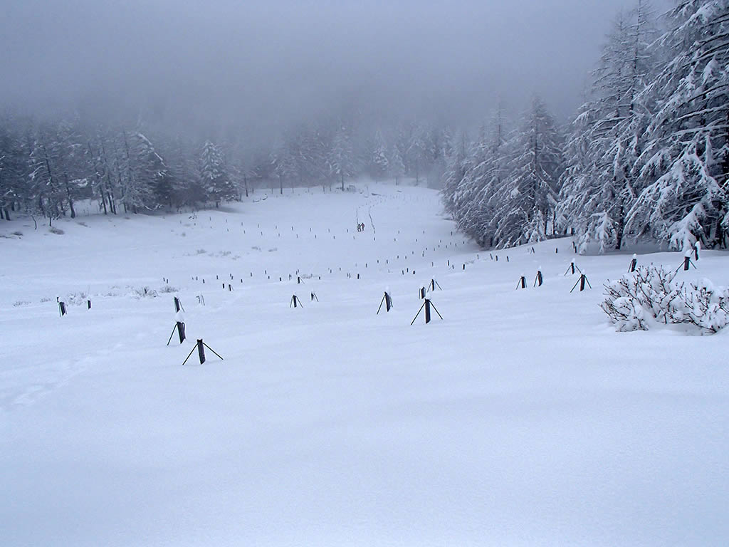 一番の急斜面を滑ります。杭に注意しながら滑り降りていきます。