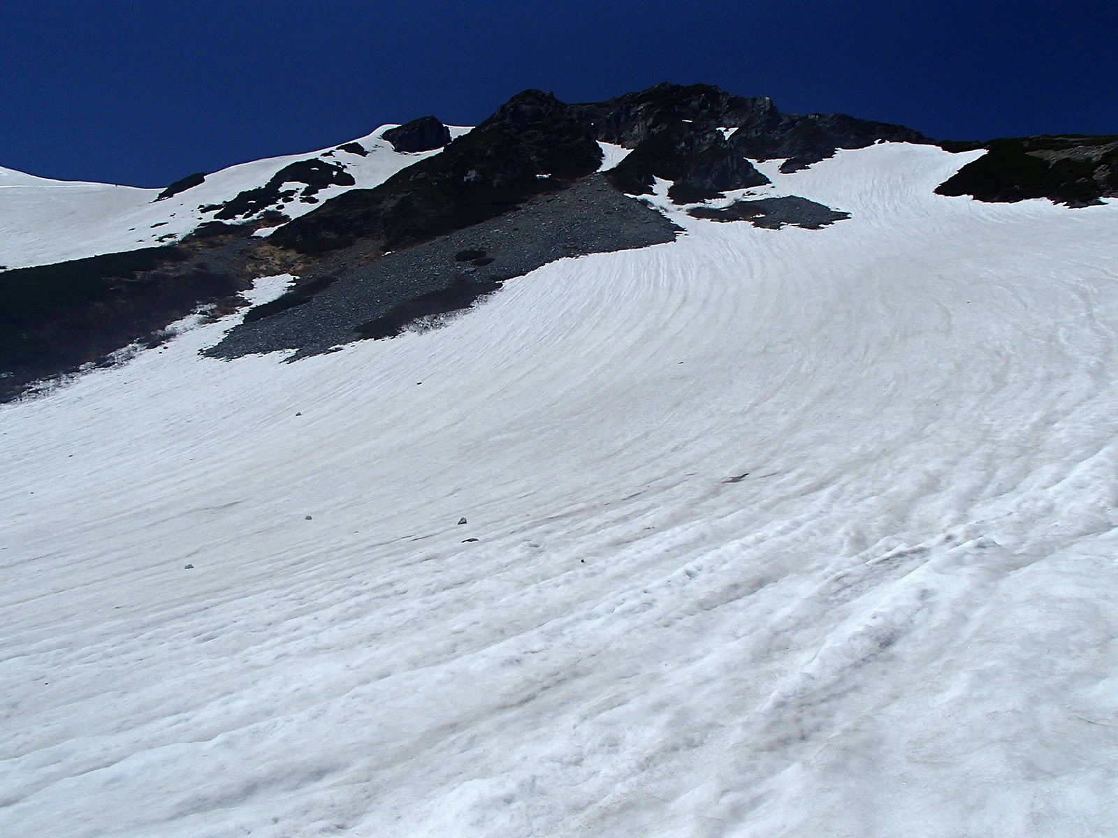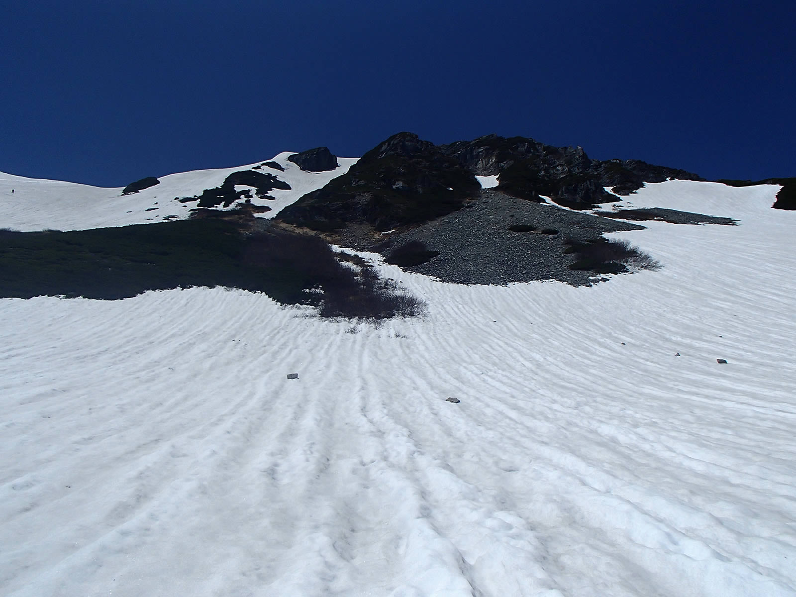 ハイマツがだいぶ出てきていますので、ここは大きく迂回する必要があります。(登りながら滑るルートの確認をする必要が無ければ、針ノ木峠経由で針ノ木岳に登った方が楽な気がします)