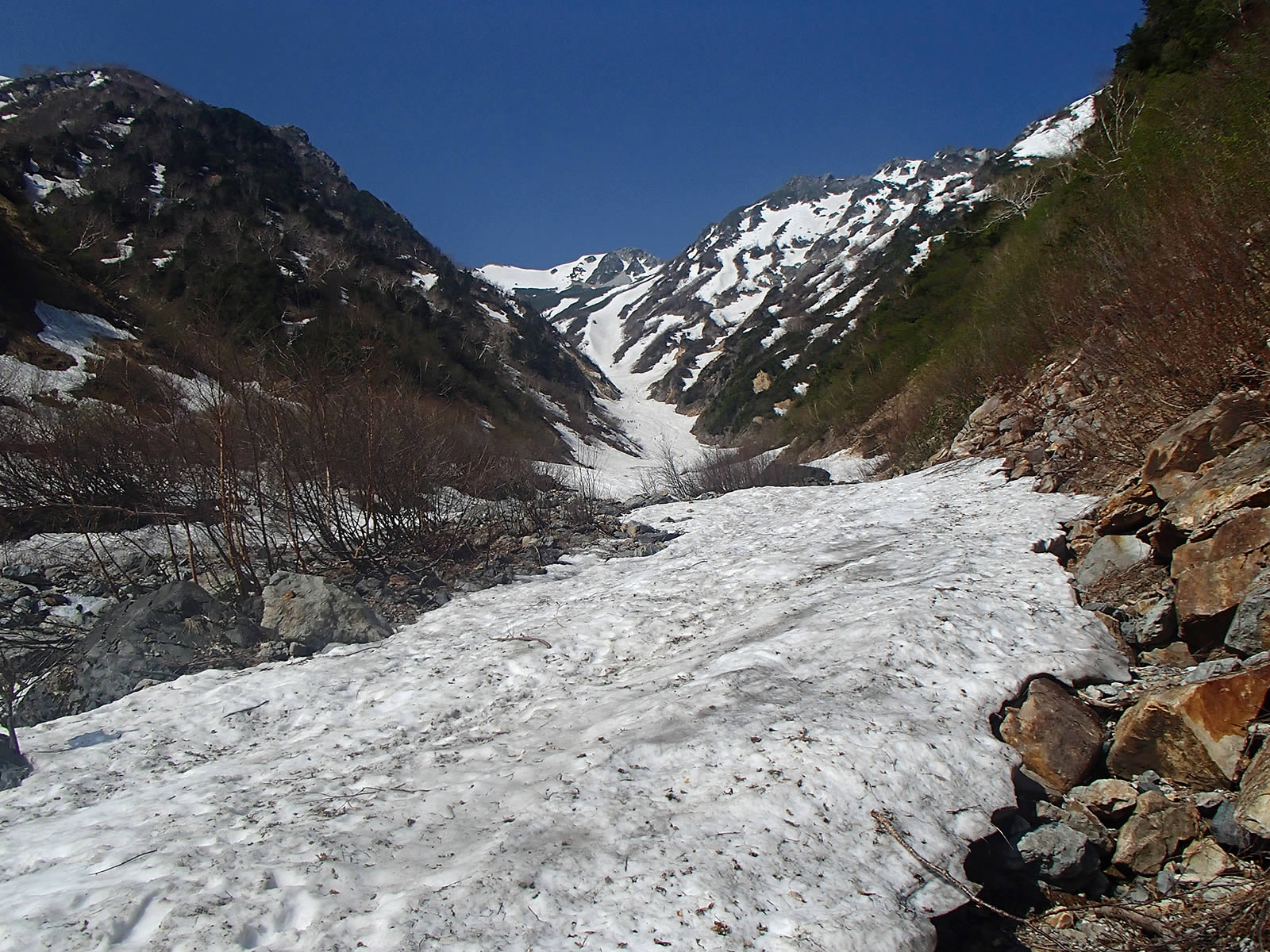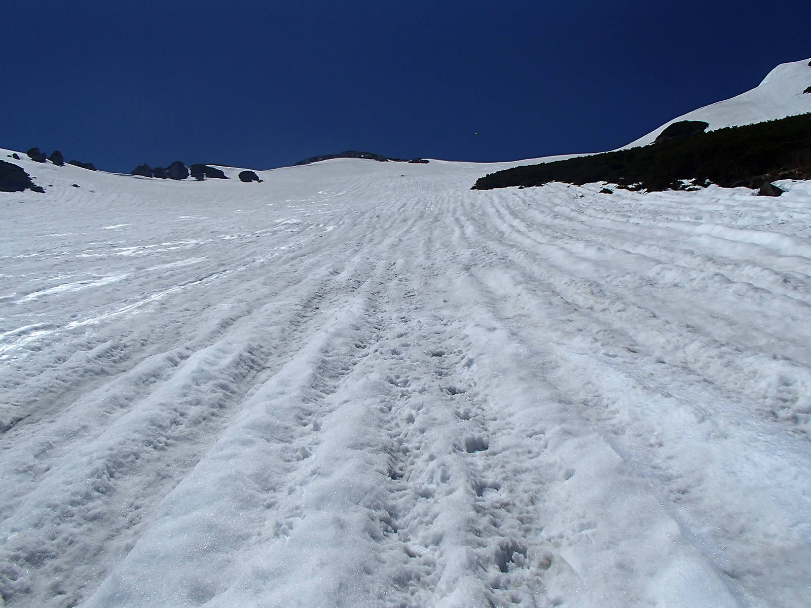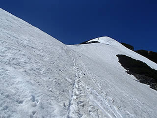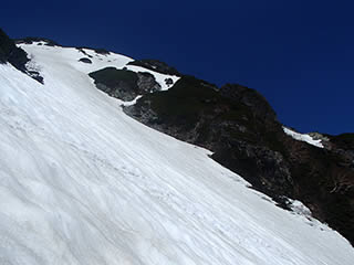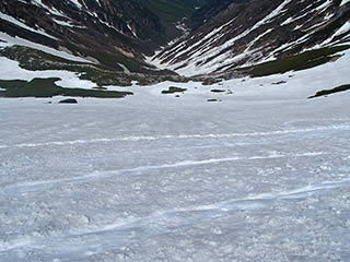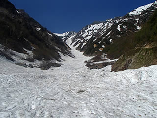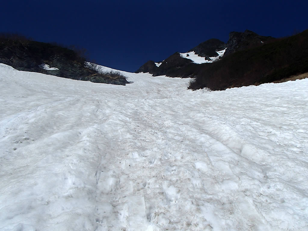 少し進んだ辺りで雪渓が見えてきましたので雪渓に下ります。明確な踏み跡があります。